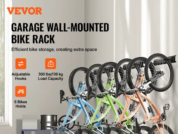 300 lbs/136 kg Strong Support: Engineered for durability, our steel garage bike rack's hooks each hold up to 50 lbs/22.68 kg, with a total capacity of 300 lbs/136 kg. Ideal for securely storing your bikes.