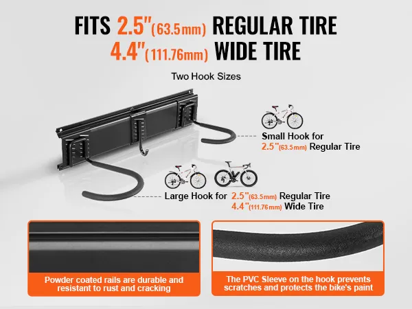 Versatile Hooks: To accommodate a variety of bike types, this bike rack comes with two hook sizes, capable of hanging standard 2.5 in/63.5 mm tires and wider 4.4 in/111.76 mm fat tires. Suitable for mountain bikes, road bikes, folding bikes, adult bikes, and children's bikes.