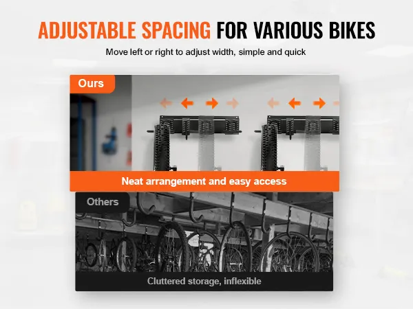 Adjustable Spacing: The bike wall rack's hooks are attached to the rail with a slot-and-slide mechanism, allowing the hooks to move laterally. This design lets you adjust the spacing between hooks to fit different bicycle types. Tailor the setup to your specific storage needs.