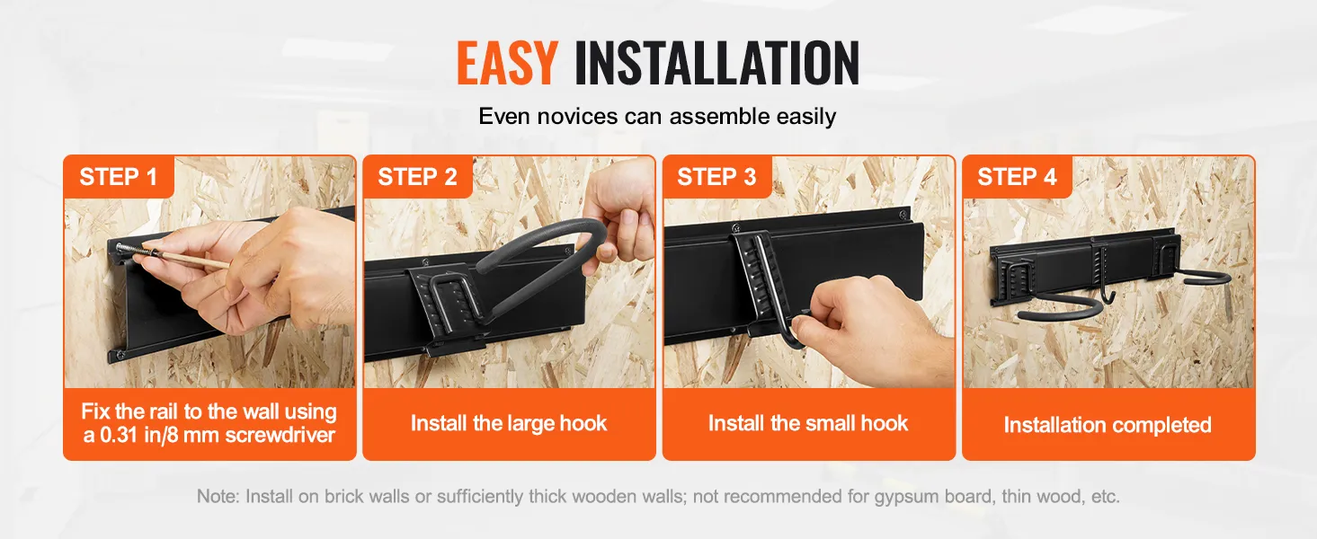 Install with Ease: Setting up this hanging bike rack is a breeze—just grab a 0.31 in/8 mm screwdriver and you're set. We recommend mounting it on solid walls like brick or sturdy wood with sufficient thickness to ensure stability and security.