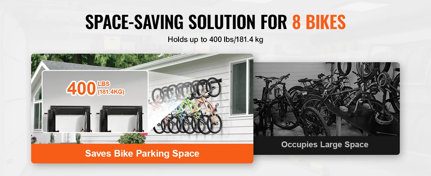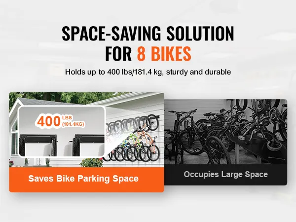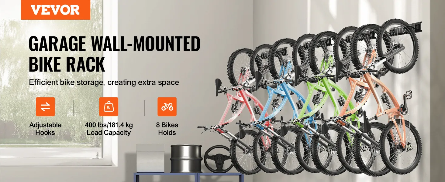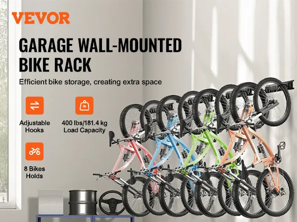 400 lbs/181.4 kg Strong Support: Engineered for durability, our steel garage bike rack's hooks each hold up to 50 lbs/22.68 kg, with a total capacity of 400 lbs/181.4 kg. Ideal for securely storing your bikes.