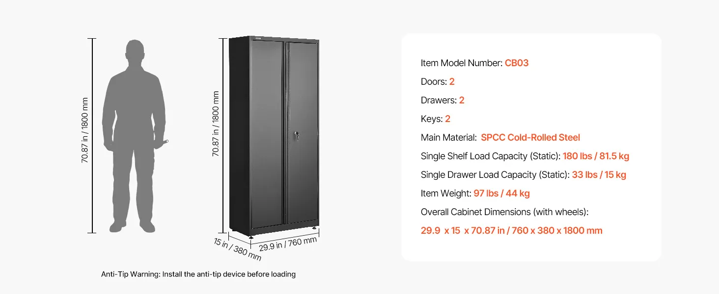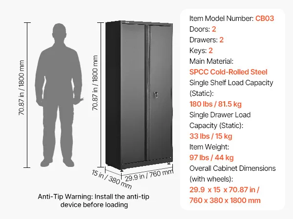 Ruime en goed georganiseerde opbergruimte: Deze metalen kast met 2 deuren en 2 lades meet 76 x 38 x 180 cm. De diepe lades bieden voldoende opbergruimte voor elektrisch gereedschap, gereedschapskisten, schoonmaakspullen en dossiers. Duidelijke montage-instructies voor een snelle en eenvoudige installatie zijn inbegrepen.