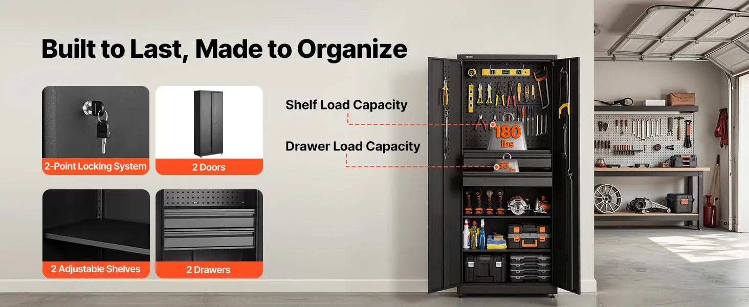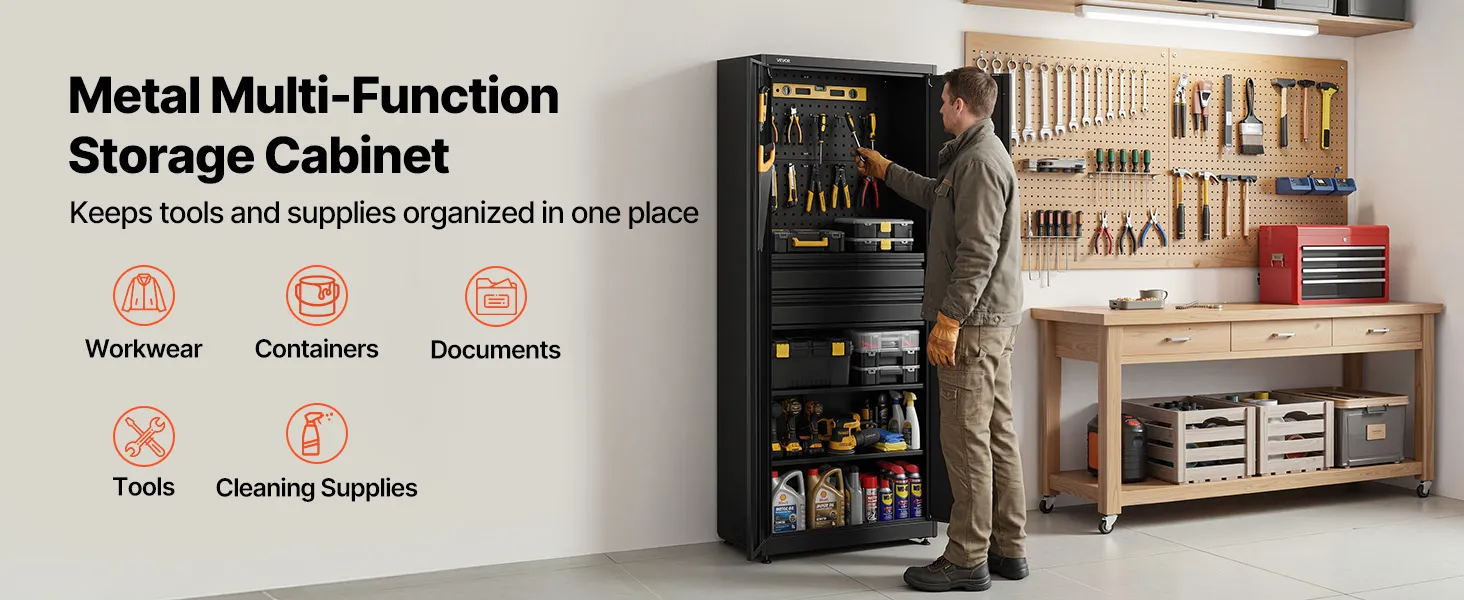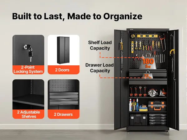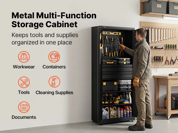 Deze garagekast is ontworpen voor het opbergen van elektrisch gereedschap en zwaar materieel en biedt een stabiele ondersteuning voor uw gereedschap. De kast is vormvast, wat zorgt voor betrouwbare stabiliteit bij langdurig gebruik.