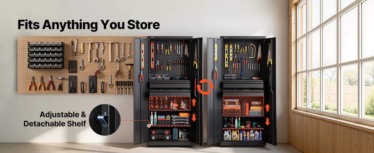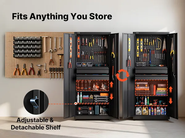 Flexibele indeling voor al uw gereedschap: deze garagekast past zich aan uw behoeften aan. Het pegboard biedt ruimte om gereedschap op te hangen of de opbergruimte uit te breiden. Dankzij de verstelbare planken kunnen grote en kleine spullen worden opgeborgen en wordt elke centimeter optimaal benut.