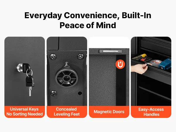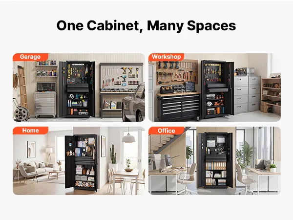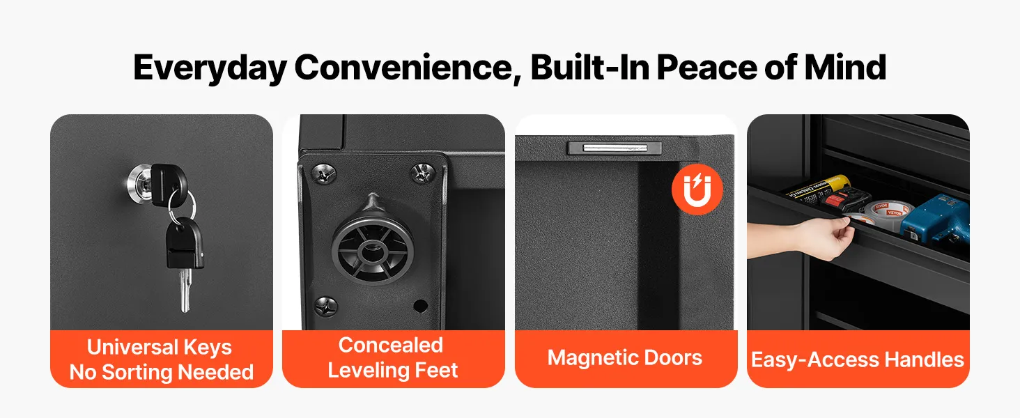 Handig en veilig voor dagelijks gebruik: magnetische deuren sluiten stevig, ergonomische handgrepen zorgen voor een veilige grip en afsluitbare deuren beschermen uw waardevolle spullen. Deze afsluitbare gereedschapskast is ideaal voor garages, werkplaatsen, kantoren of als opbergruimte in huis.