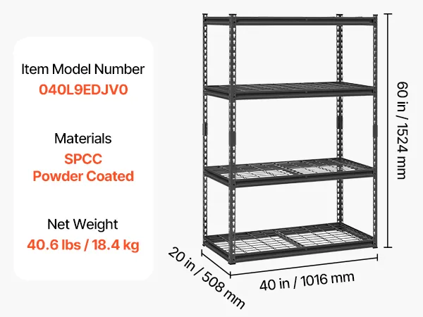VEVOR Storage Shelves, 2400 lbs, 4 Tier Heavy Duty Garage Shelving, 20" D x 40" W x 60" H Adjustable Metal Shelves for Industrial Shelving Unit Utility Shelf, for Kitchen, Warehouse, Basement, Black