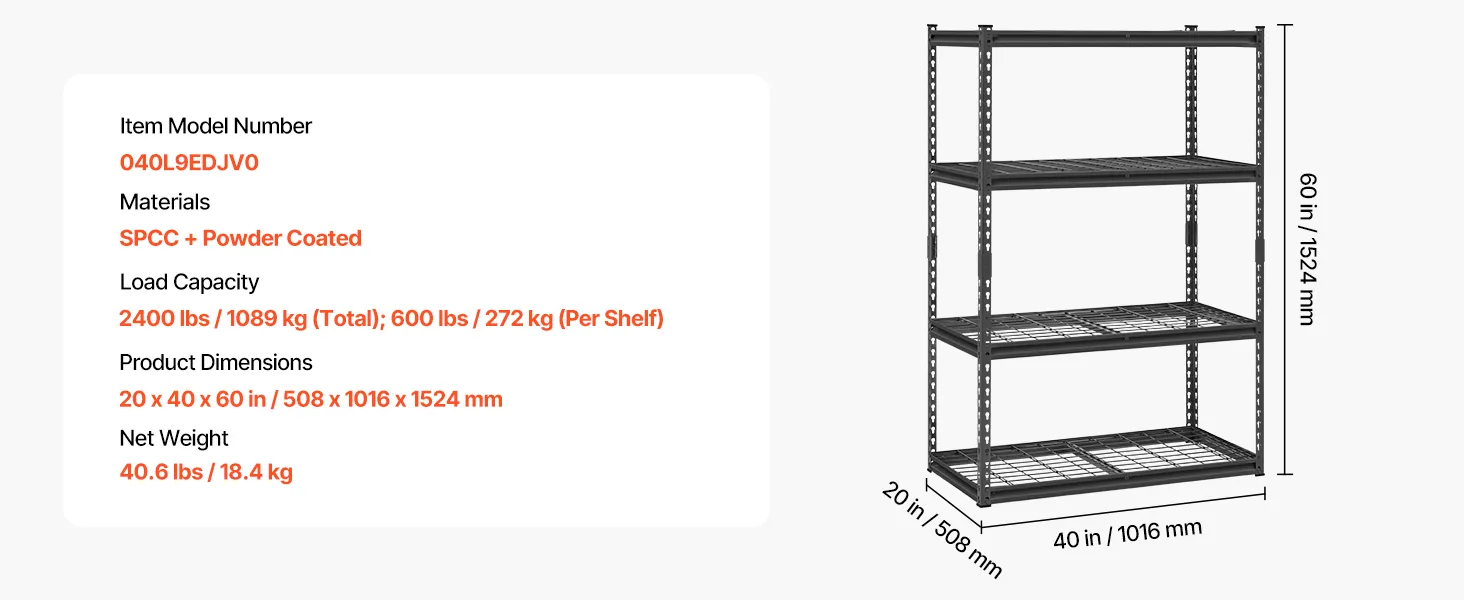 2400 lbs Load Capacity: With a maximum total capacity of 2400 lbs and 600 lbs per shelf, our garage shelving unit allows you to store more items and tools in your garage or warehouse.