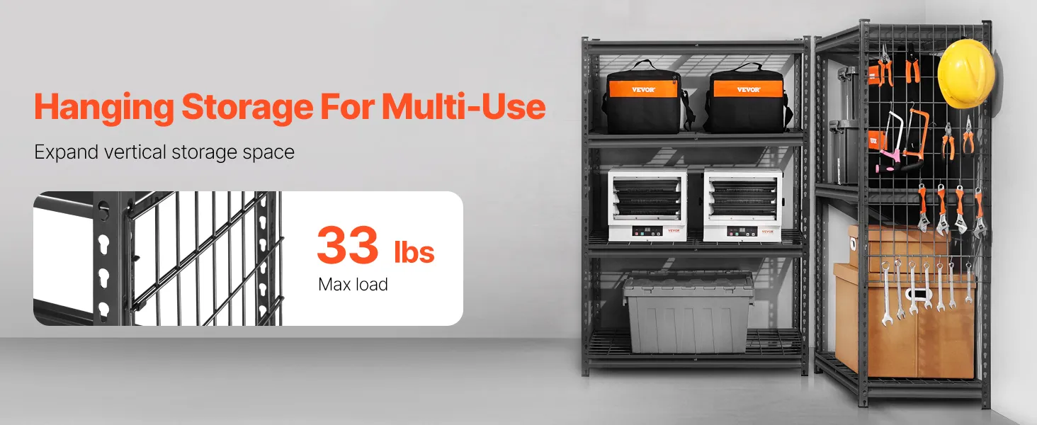 Flexible Design: The adjustable shelf height accommodates various items of different sizes. Our storage shelf for garage also comes with board hooks for side-mounting excess grid plates, expanding your hanging storage space.