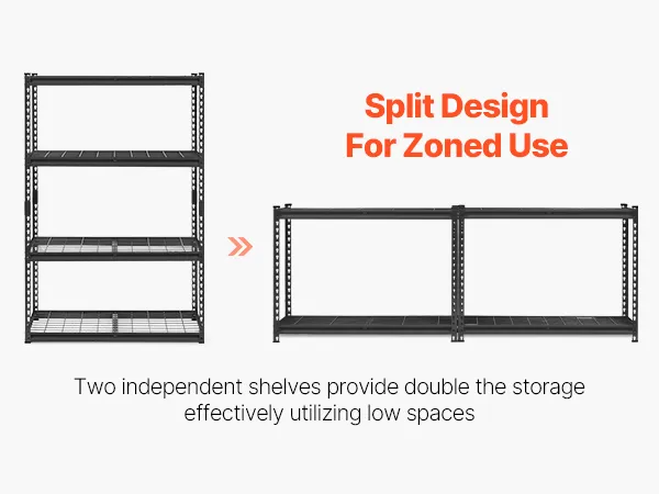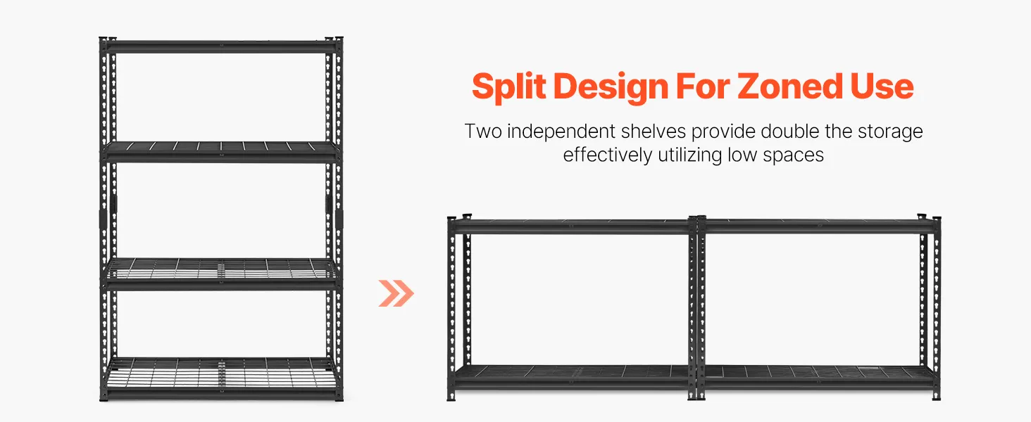The split design of garage storage shelf enables maximum storage functionality in limited-height spaces such as under stairs, basements, and attics.