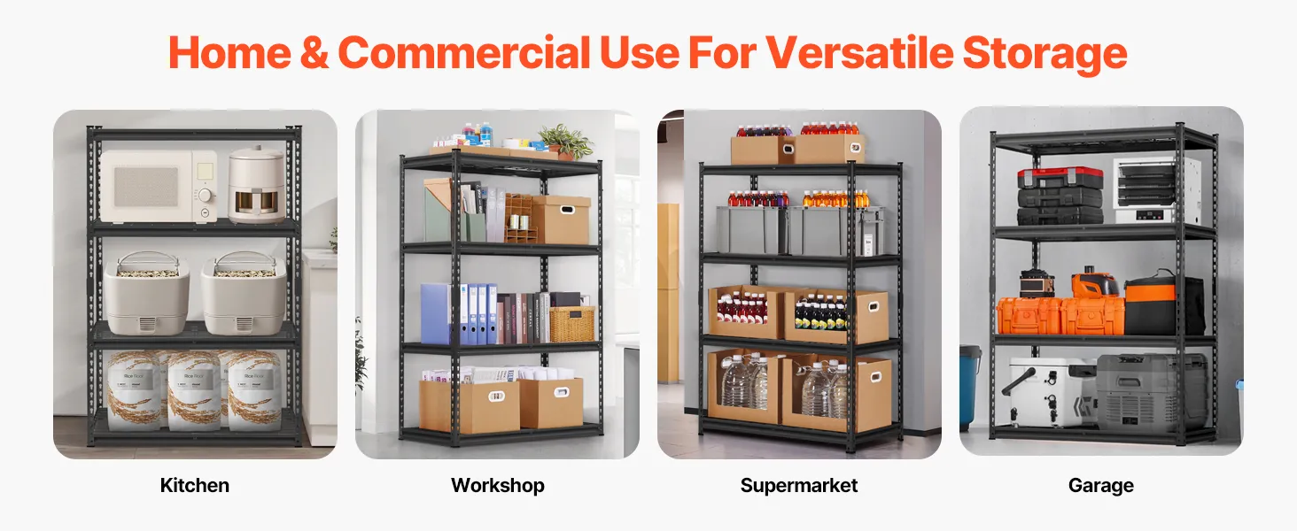 This versatile garage shelving unit is ideal for both home and commercial use, with a compact size that easily fits into garages, kitchens, balconies, studios, and storage rooms.