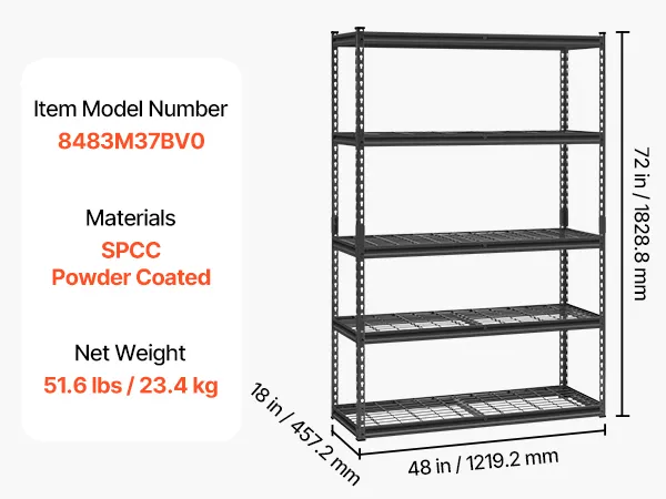 VEVOR Opslagstelling, 1134 kg, 5-laags zware garagestelling, 457,2 x 1219,2 x 1828,8 mm, verstelbare garagestelling voor industriële stellingen, kelderstelling, voor keuken, magazijn, kelder, zwart