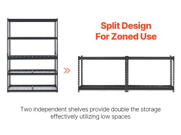 Het gespleten ontwerp van het garageopslagrek zorgt voor maximale opslagfunctionaliteit in ruimtes met beperkte hoogte, zoals onder trappen, kelders en zolders.