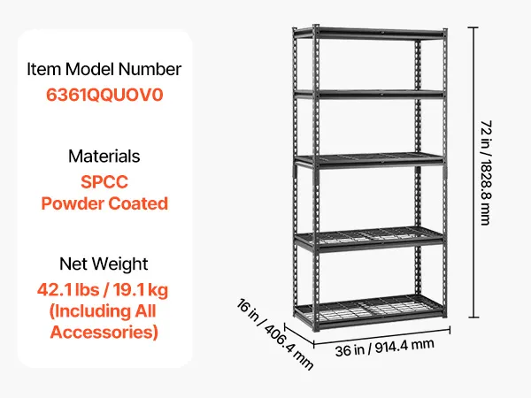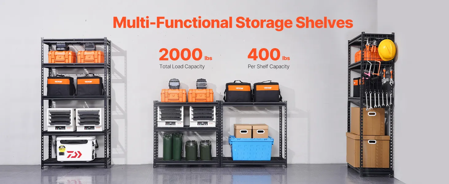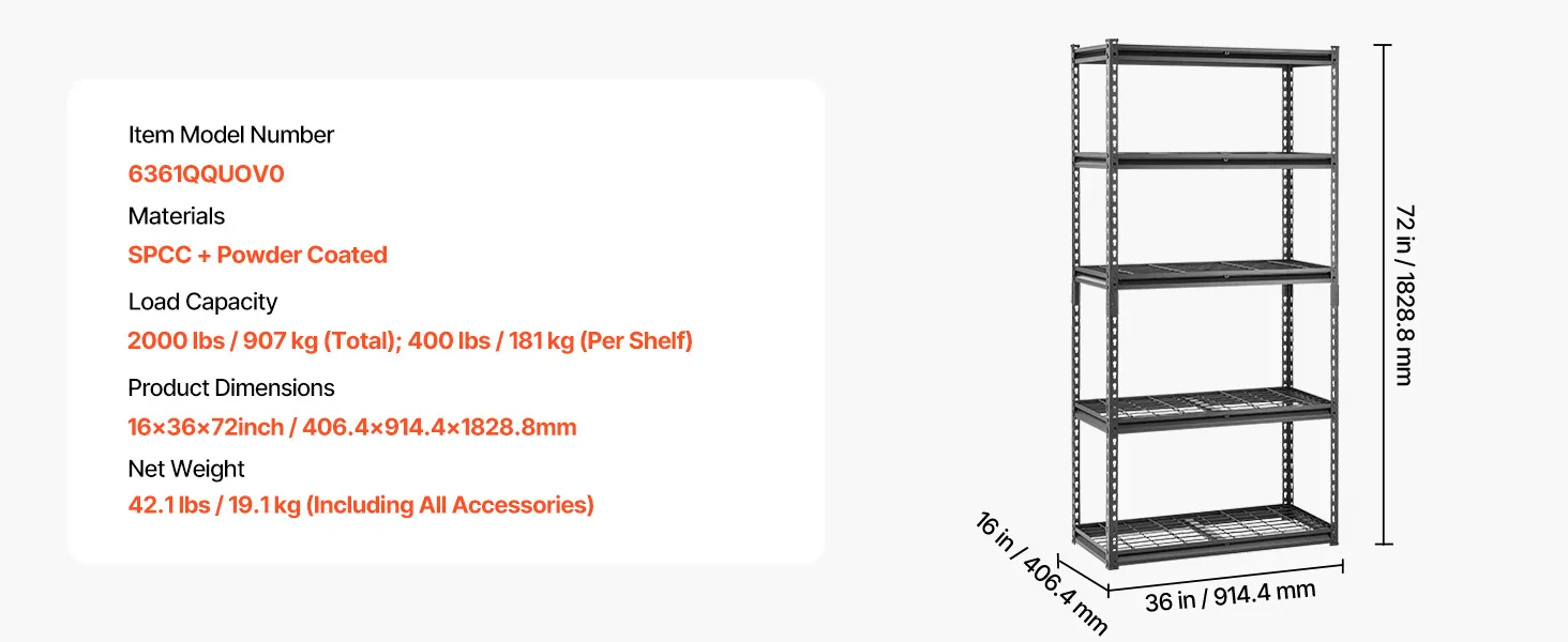 907 kg draagvermogen: met een maximaal totaal draagvermogen van 907 kg en 181 kg per plank kunt u met ons garagerek meer spullen en gereedschap in uw garage of magazijn opbergen.