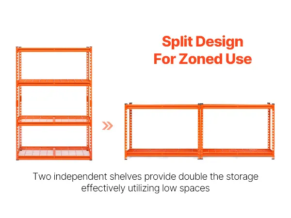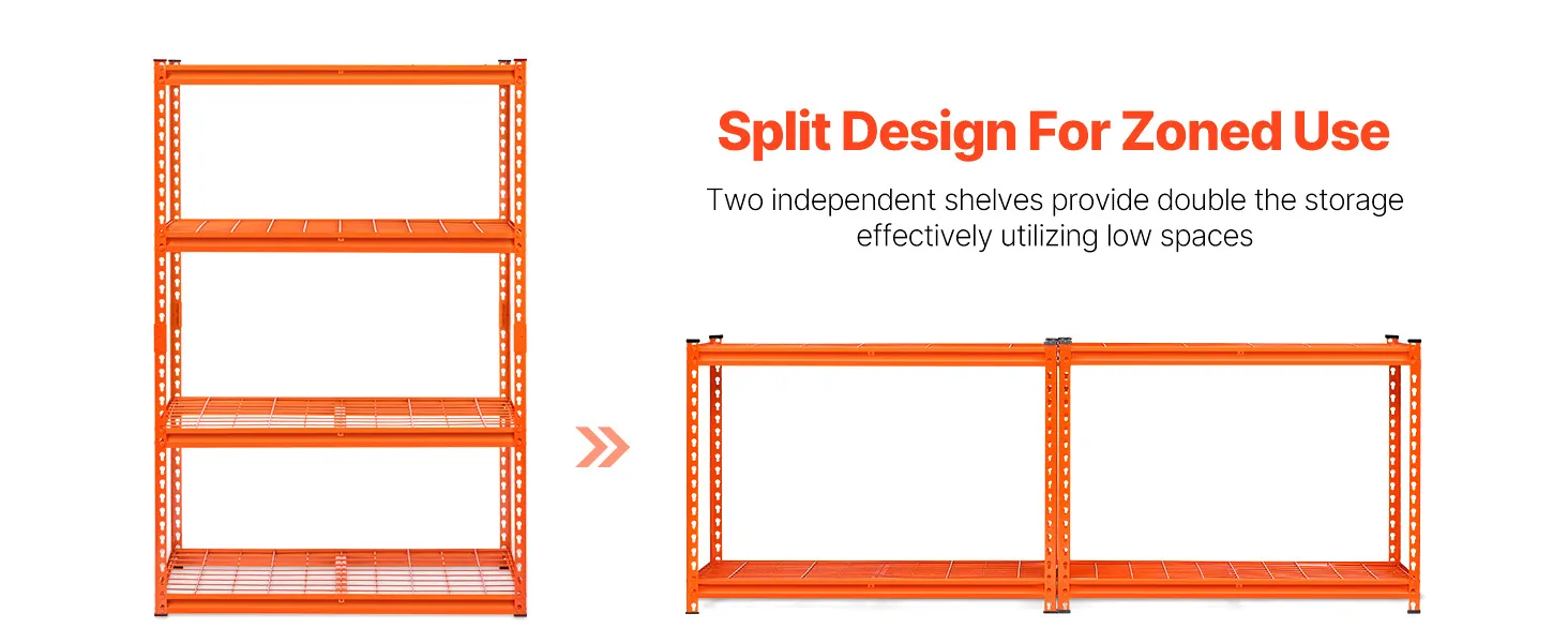 Het gespleten ontwerp van het garageopslagrek zorgt voor maximale opslagfunctionaliteit in ruimtes met beperkte hoogte, zoals onder trappen, kelders en zolders.