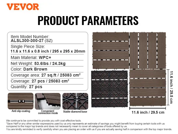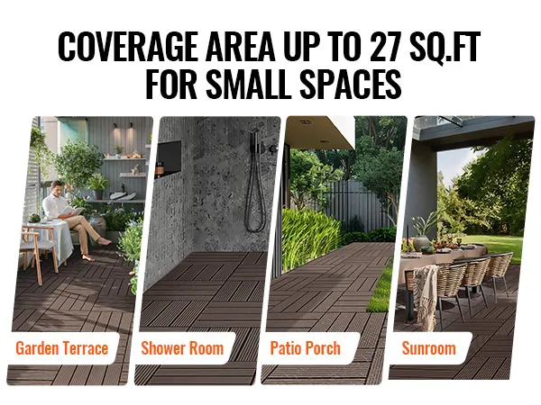 27 sq. ft. Coverage: Each set includes 27 tiles, measuring 11.6x11.6 inches, perfect for outdoor patios, porches, or indoor showers and laundry rooms.