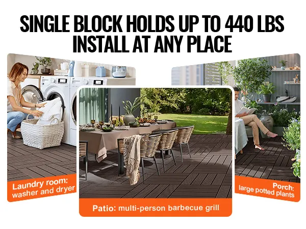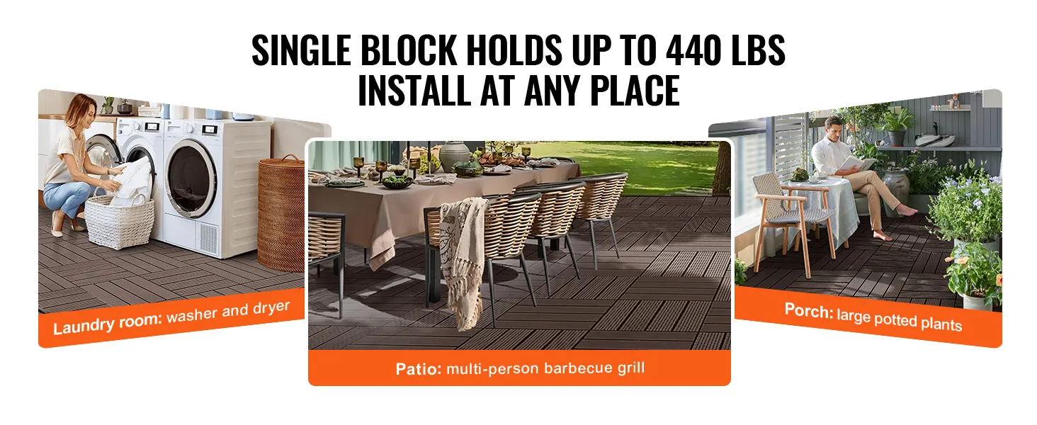440 lbs Load Capacity: With a thickness of 0.8 inches, the patio tiles support up to 440 lbs, easily handling heavy items like trucks, bathtubs, sofas, washing machines, and grills.