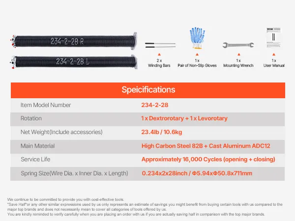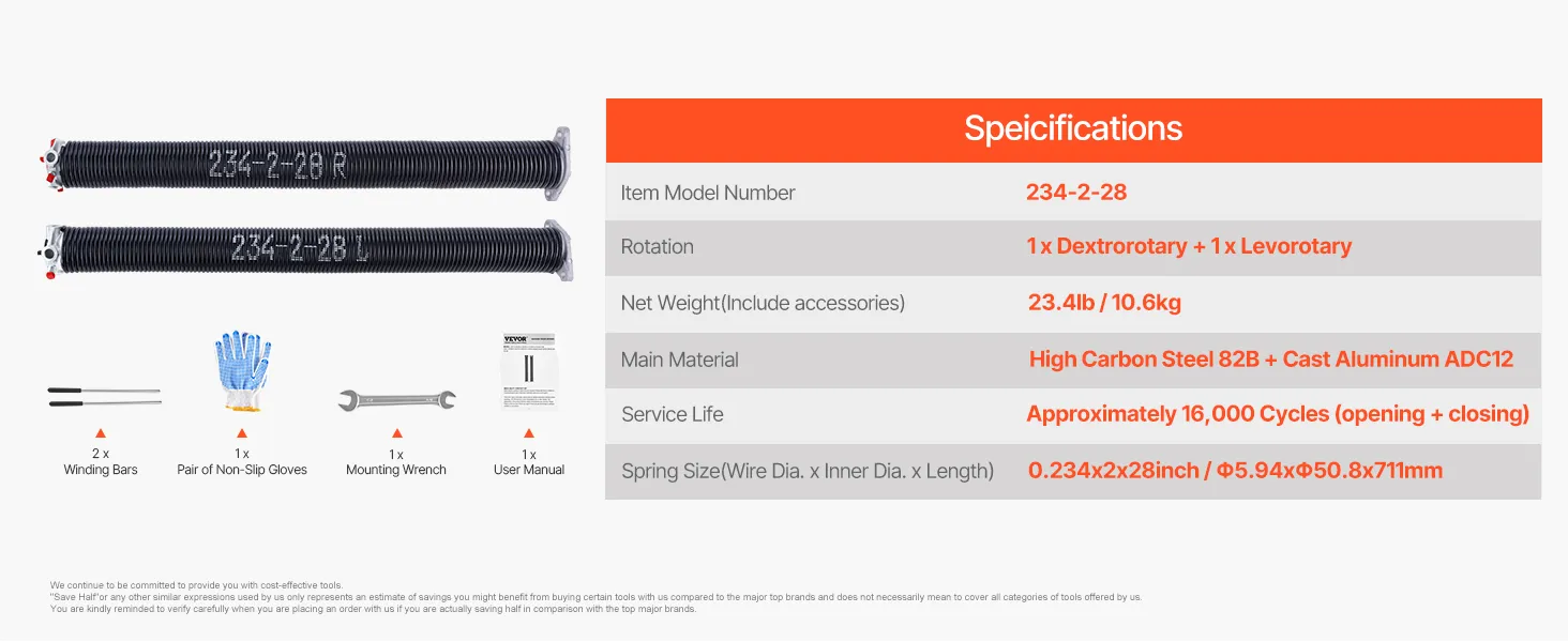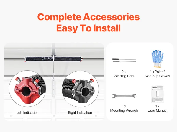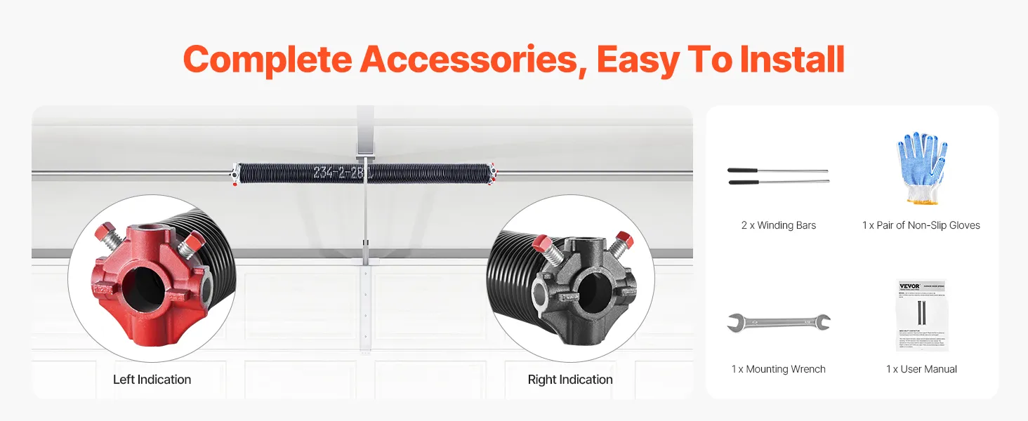 Complete Accessories: All the necessary accessories are included - 2 garage door springs (1 left and 1 right), 2 winding bars, a pair of anti-slip gloves, a mounting wrench, and a user manual