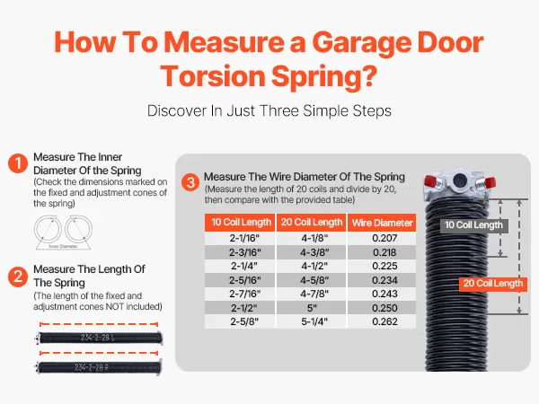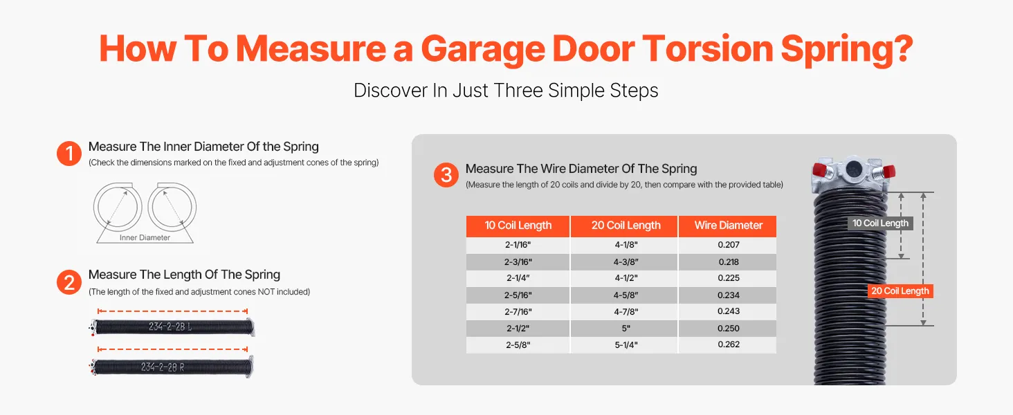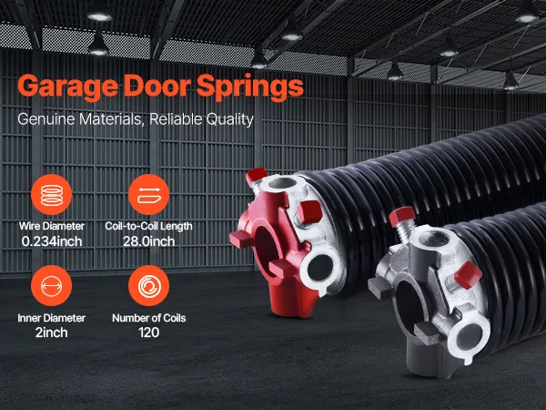 Specifications and Dimensions: Wire Diameter: Φ0.234 inch / 5.94 mm; Inner Diameter: Φ 2inch / 50.8mm; Number of Coils: 120; Length: 28.0 inch / 711 mm. Please confirm that the wire diameter and length are identical to your original garage door torsion springs for time-saving replacement