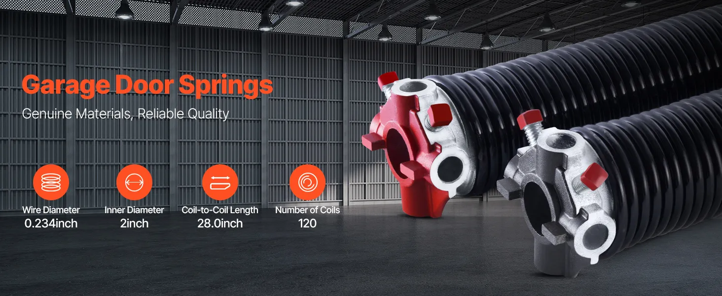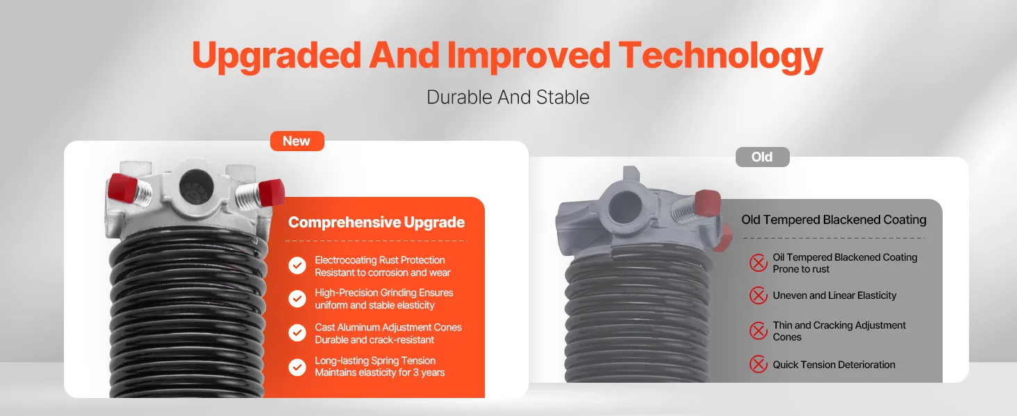 Sturdy and Durable: Our garage door springs are made of professionally heat-treated spring steel coils and aluminum cones. With advanced electrocoating surface treatment, they boast excellent corrosion resistance and wear resistance, eliminating the need for additional lubrication and providing a longer lifespan