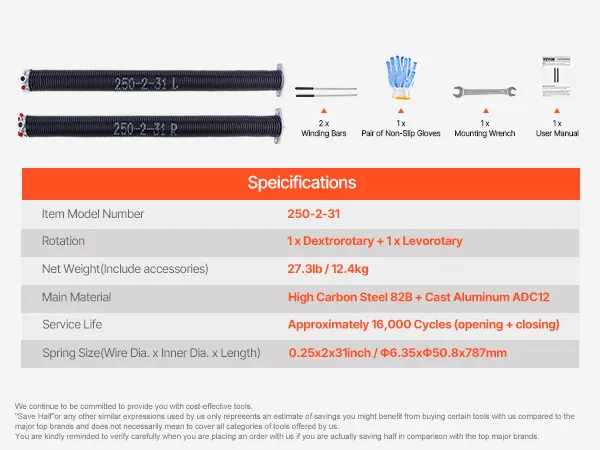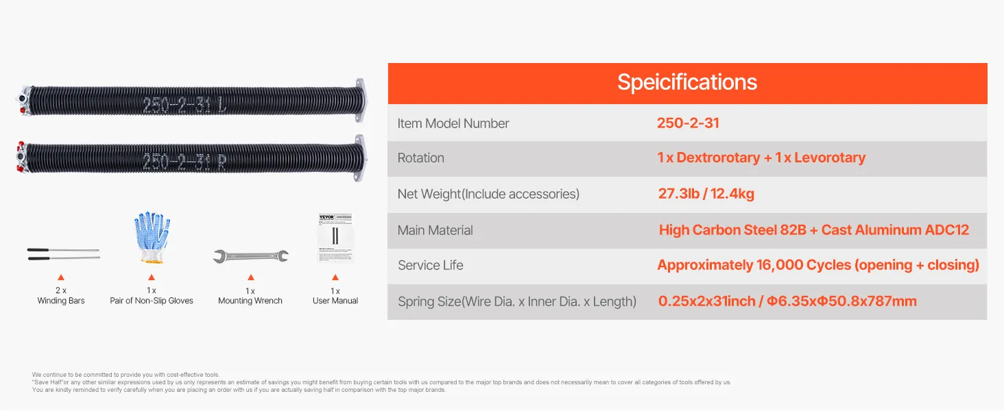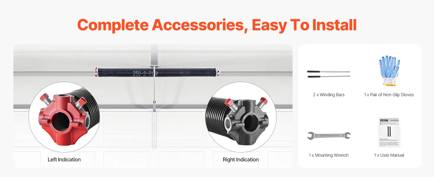 Complete Accessories: All the necessary accessories are included - 2 garage door springs (1 left and 1 right), 2 winding bars, a pair of anti-slip gloves, a mounting wrench, and a user manual