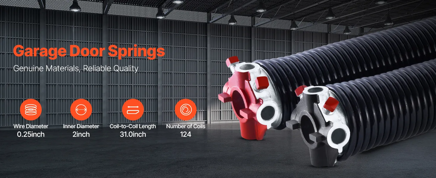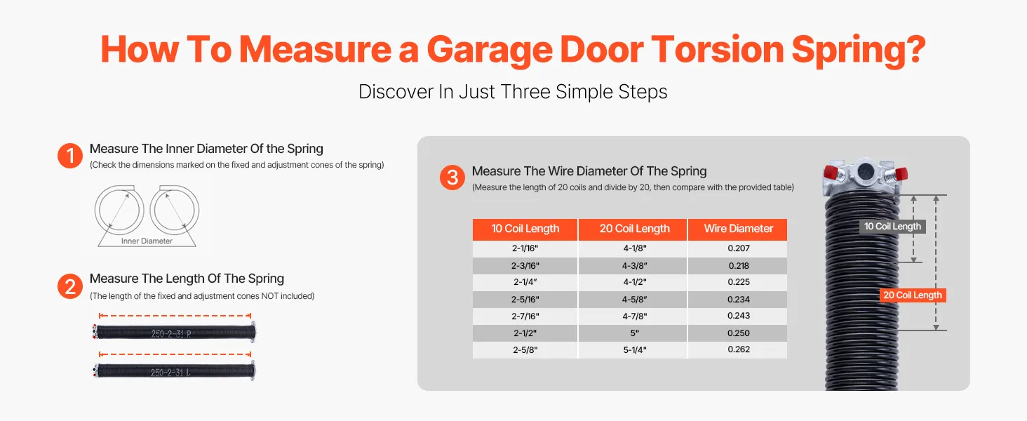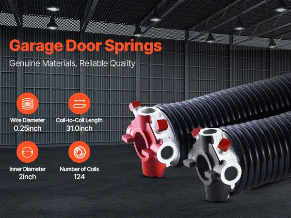Specifications and Dimensions: Wire Diameter: Φ0.25 inch / 6.35 mm; Inner Diameter: Φ 2inch / 50.8mm; Number of Coils: 124; Length: 31.0 inch / 787 mm. Please confirm that the wire diameter and length are identical to your original garage door torsion springs for time-saving replacement