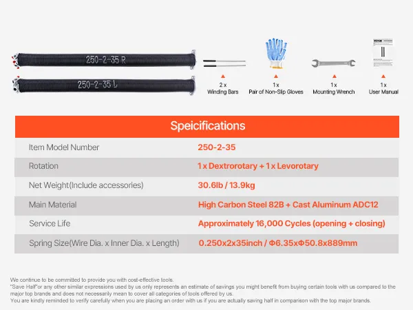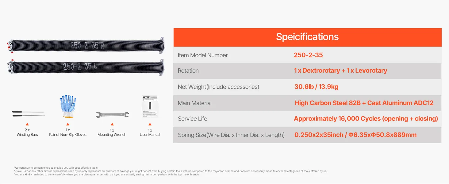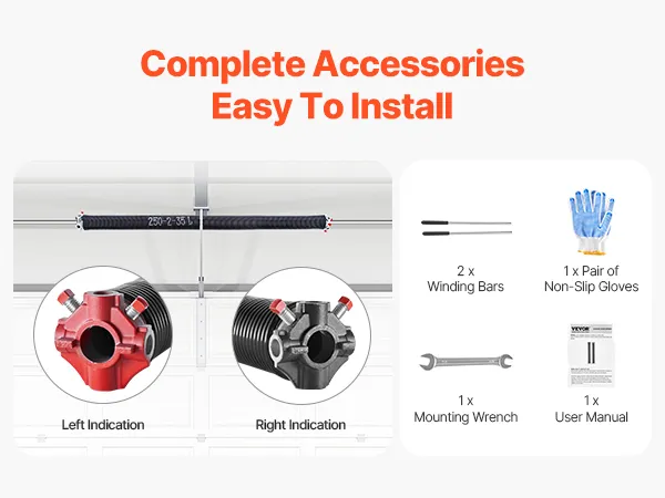Complete Accessories: All the necessary accessories are included - 2 garage door springs (1 left and 1 right), 2 winding bars, a pair of anti-slip gloves, a mounting wrench, and a user manual