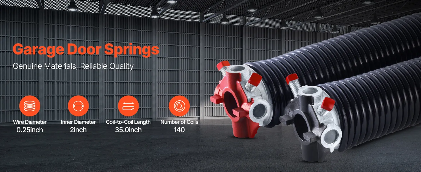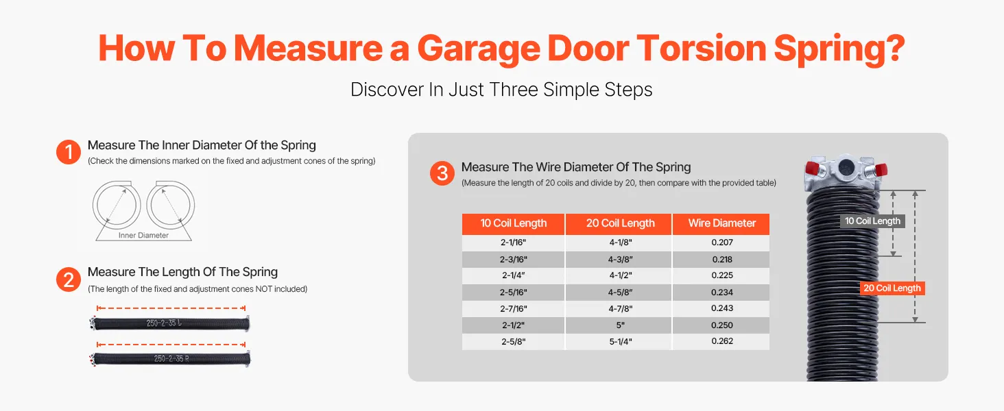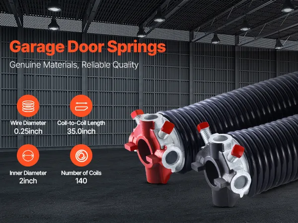Specifications and Dimensions: Wire Diameter: Φ0.25 inch / 6.35 mm; Inner Diameter: Φ 2inch / 50.8mm; Number of Coils: 140; Length: 35.0 inch / 889 mm. Please confirm that the wire diameter and length are identical to your original garage door torsion springs for time-saving replacement