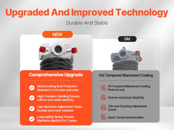 Sturdy and Durable: Our garage door springs are made of professionally heat-treated spring steel coils and aluminum cones. With advanced electrocoating surface treatment, they boast excellent corrosion resistance and wear resistance, eliminating the need for additional lubrication and providing a longer lifespan