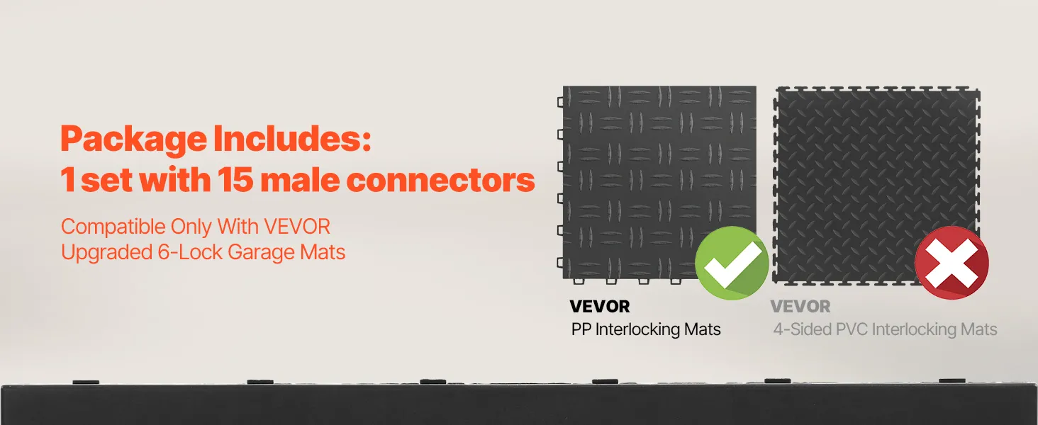 Compatibel met VEVOR PVC 4-zijdige in elkaar grijpende vloermatten. Eén set randbeschermers biedt volledige bescherming voor 8 PVC 4-zijdige in elkaar grijpende garagematten.