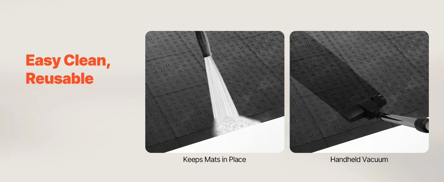 Schoonmaken is eenvoudig. Veeg het oppervlak van deze garagevloertegelrandset schoon en klaar voor gebruik met een dweil of doek, of gebruik een stofzuiger.