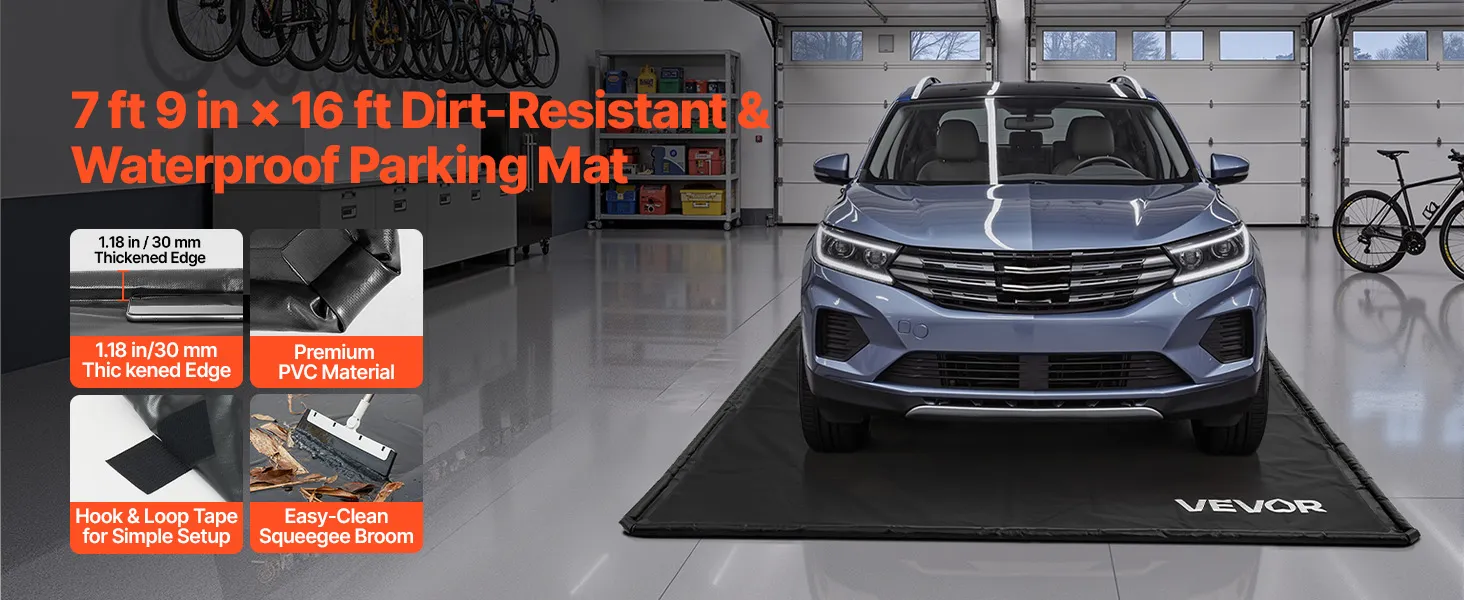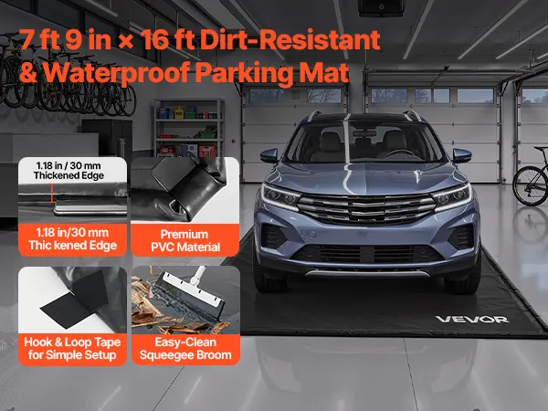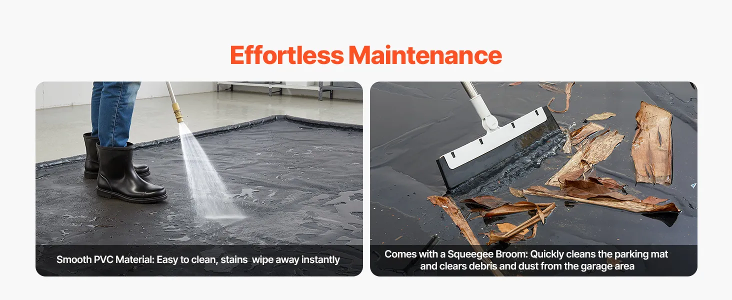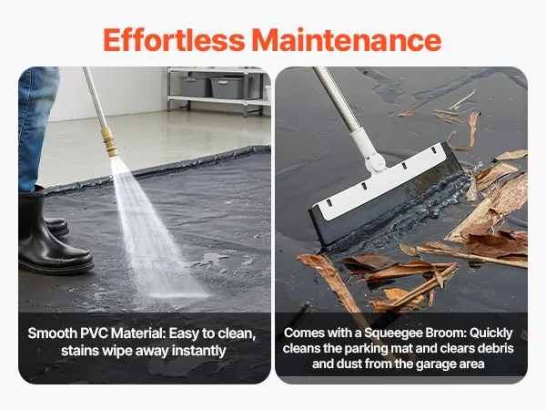 Eenvoudig te reinigen: De garagemat heeft een glad oppervlak waardoor vlekken gemakkelijk te verwijderen zijn met een doekje. De mat wordt geleverd met een wisser om modder en vuil snel van de mat te verwijderen, wat de schoonmaakefficiëntie verbetert en de garage schoon en netjes houdt.