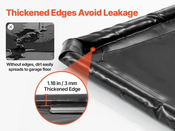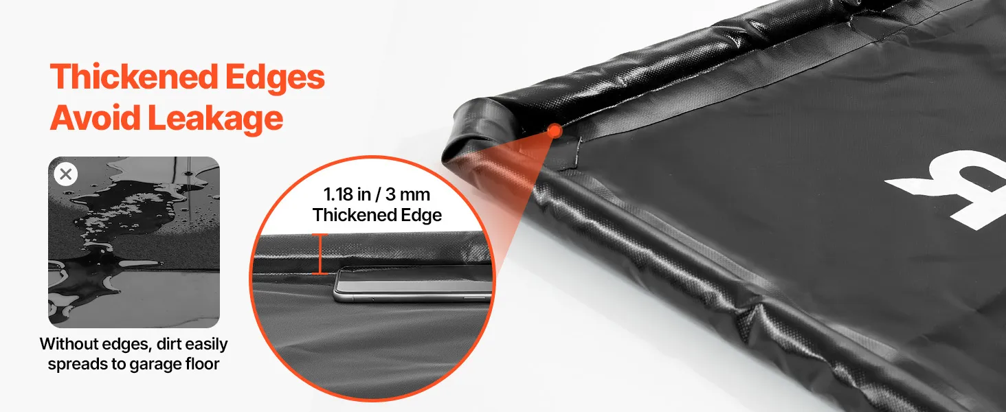 Met een opstaande rand tot 30 mm dik voorkomt deze druipmat voor garagevloeren dat vloeistoffen morsen. Hij zorgt ervoor dat de garagevloer droog en schoon blijft. Dit ontwerp lost het veelvoorkomende probleem van morsen van vloeistoffen bij conventionele matten op en beschermt uw garagevloer tegen olie- en watervlekken.