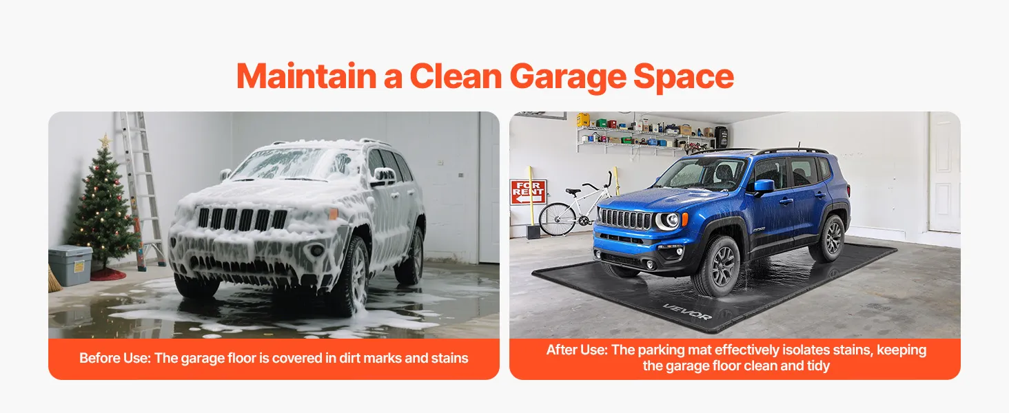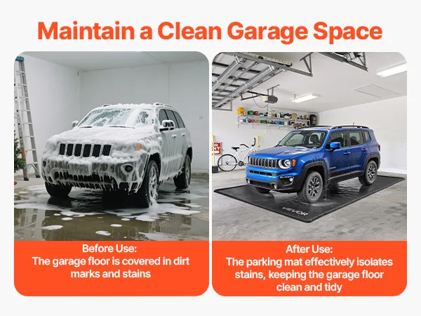 Vóór gebruik van de garagemat was de garagevloer bedekt met vuil en vlekken. Na gebruik sluit de mat effectief vlekken af en houdt de garagevloer schoon en netjes. De waterdichte en vuilafstotende eigenschappen zorgen ervoor dat de garage te allen tijde schoon blijft.