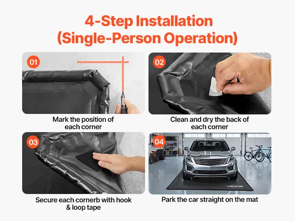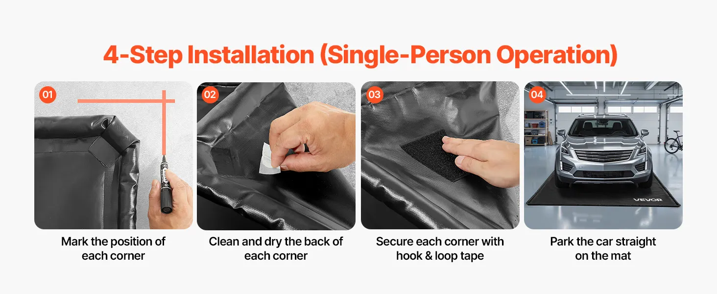 De garagemat is voorzien van klittenband, wat de installatie snel en eenvoudig maakt. Hij kan eenvoudig door één persoon worden geïnstalleerd, zonder ingewikkeld gereedschap of hulp. Dit elimineert het ongemak dat gebruikers vaak ervaren bij het installeren van parkeermatten.