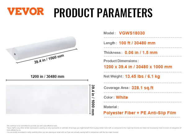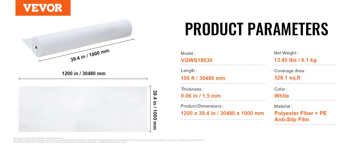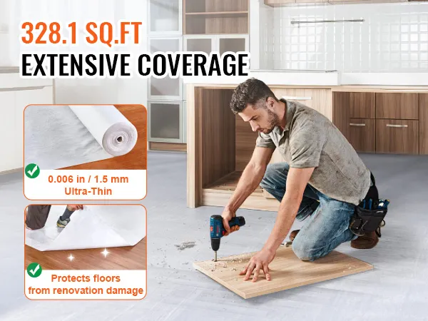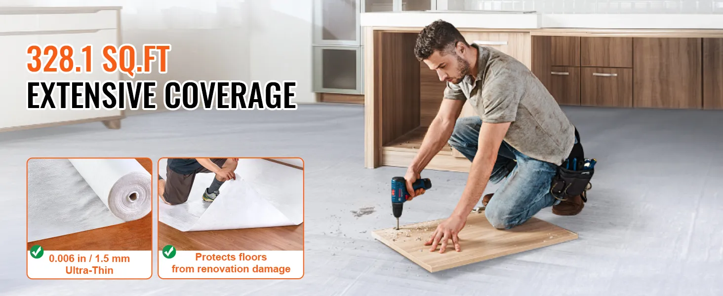 Onze vloer- en oppervlaktebescherming is ontworpen om ongeëvenaarde bescherming te bieden voor uw vloeren en tapijten tijdens bouw- en renovatieprojecten. Met een royaal dekkingsgebied van 328 sq. ft. beschermt het oppervlakken tegen verfvlekken, voetafdrukken en krassen. Het zorgt ervoor dat uw vloeren er onberispelijk uitzien. De uitgebreide maat vereenvoudigt het renovatieproces, waardoor het een essentieel hulpmiddel is voor elk project. Niet alleen is de maat indrukwekkend, maar de film is gemaakt van hoogwaardig vezelgesponnen stof, wat zorgt voor een uitzonderlijke duurzaamheid tegen slijtage. De inherente eigenschappen van het materiaal absorberen schokken, verminderen geluid en voorkomen dat water doorsijpelt, waardoor uw thuisomgeving van binnenuit wordt beschermd.