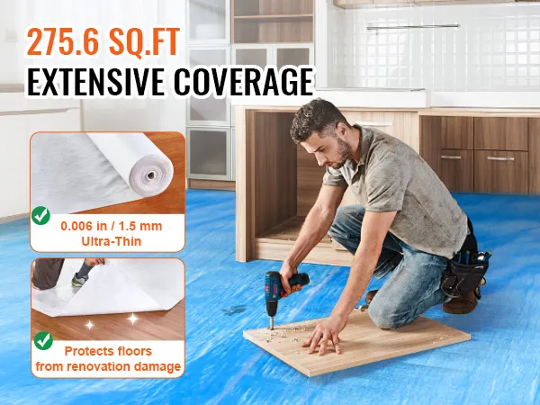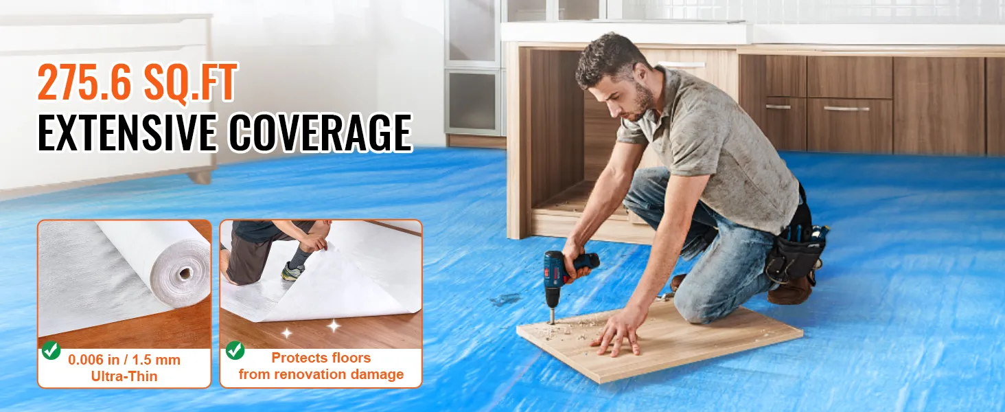 Powerful Protection: Our fiber-spun fabric floor protector covers a large area of 275 sq.ft, shielding your floors from paint, footprints, and sharp object scratches, keeping them spotless and new. It effortlessly handles renovation mess, making your projects simpler and more convenient.