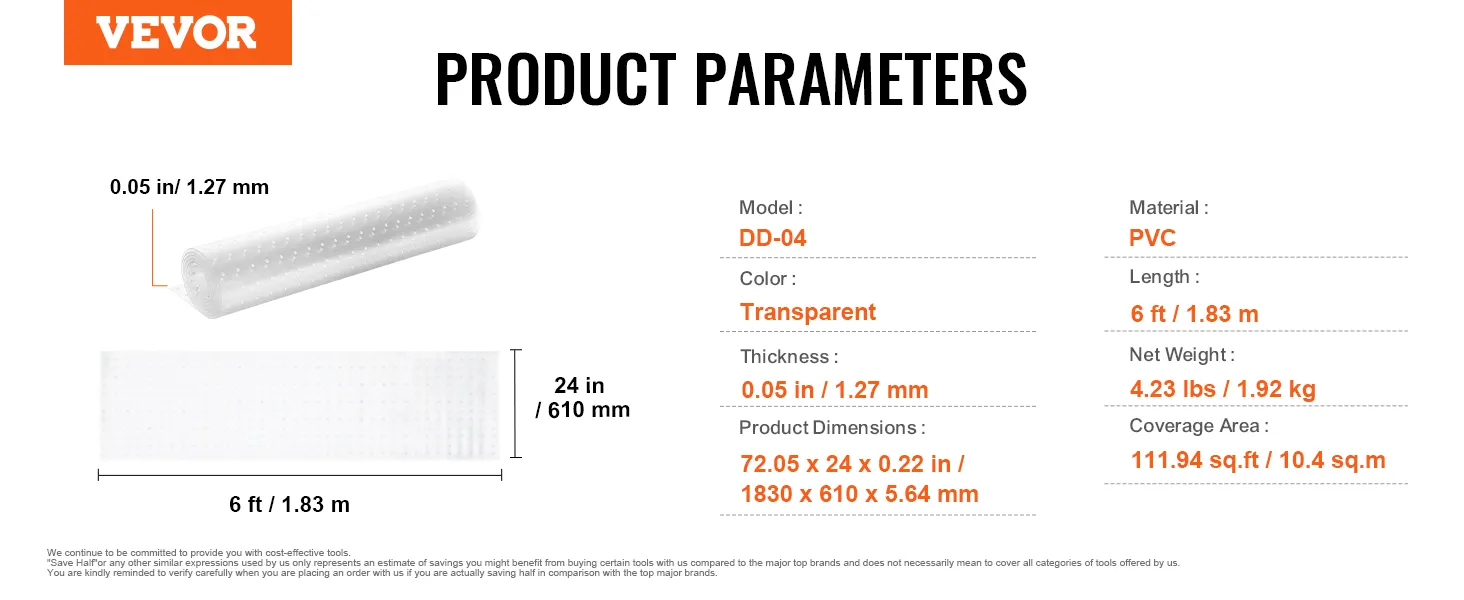 De dikte van onze tapijtbeschermer voor huisdieren is 0,05 inch. Het biedt krasbestendig en slijtvast materiaal. Met geavanceerde technologie zorgt het voor een goede pasvorm met deuropeningen terwijl de deur soepel blijft werken. Uw tapijt is volledig beschermd tegen kauwen en krabben door huisdieren vóór installatie. De precieze afmetingen en aanpasbare aard van de beschermer zorgen ervoor dat deze perfect past in gebieden waar huisdieren zich bevinden. Op deze manier blijft uw tapijt in onberispelijke staat.