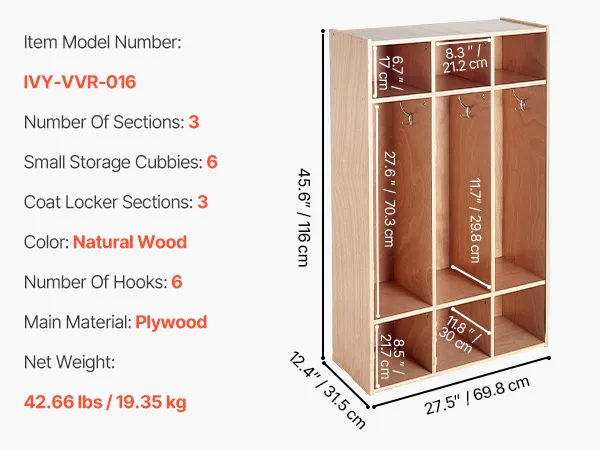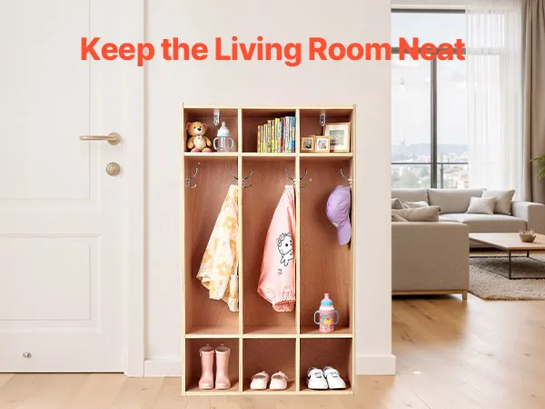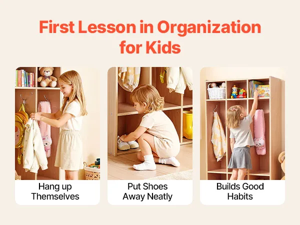 Multifunctionele opbergruimte: Deze open kinderkast biedt drie planken en zes haken voor jassen, shirts en rugzakken, evenals drie onderste vakken voor schoenen en drie bovenste vakken voor mutsen, lunchtrommels en schoolspullen. Zo blijft alles netjes en georganiseerd.