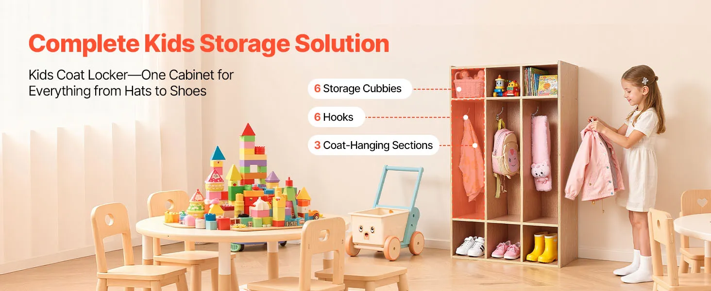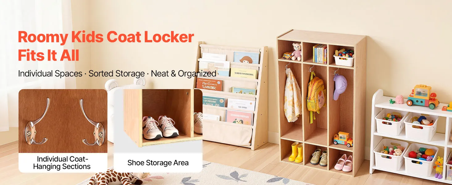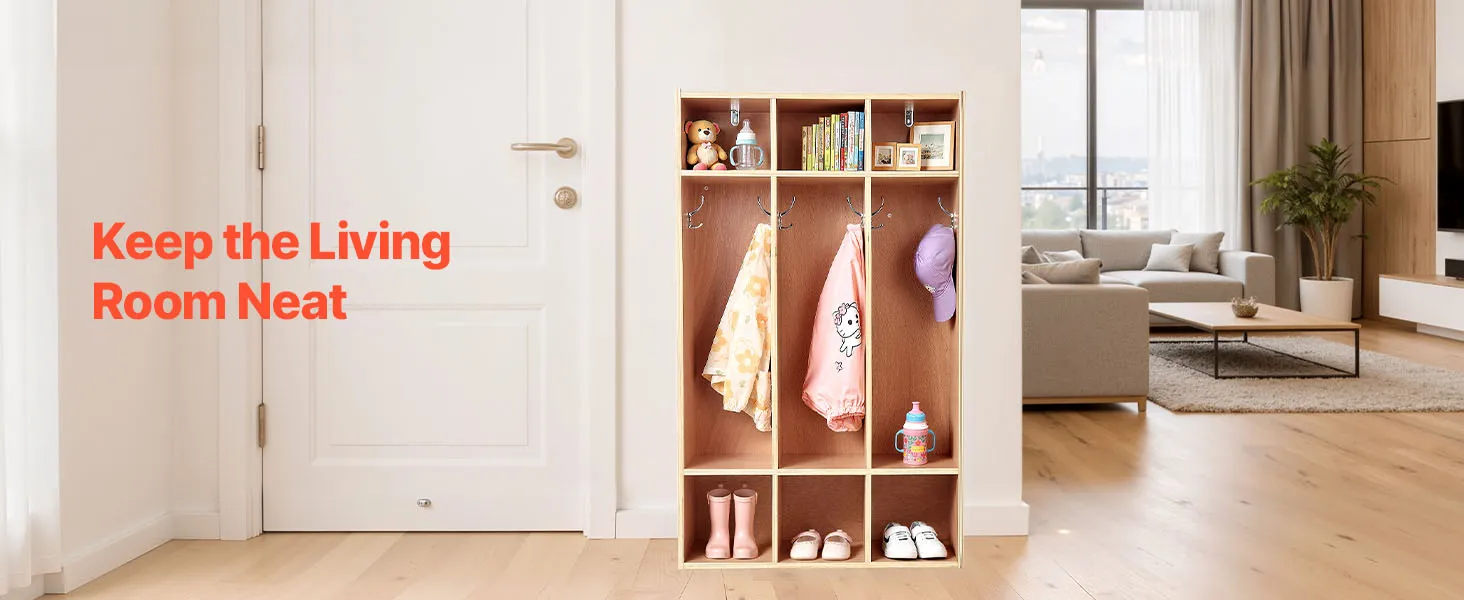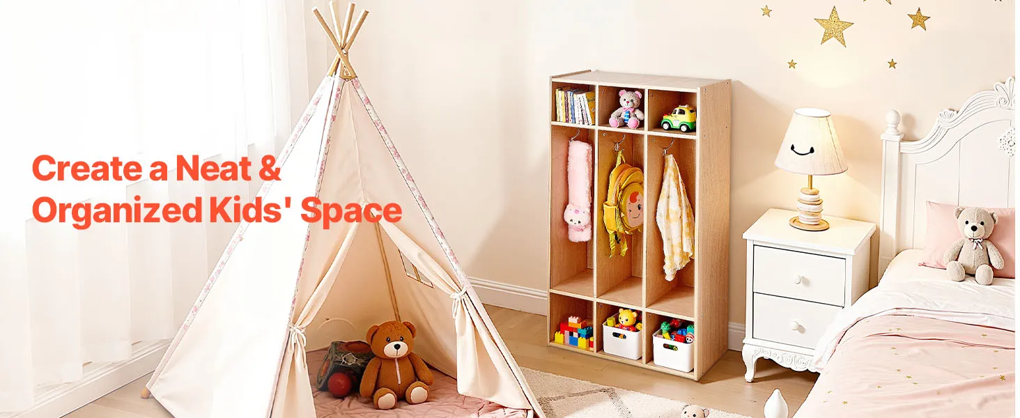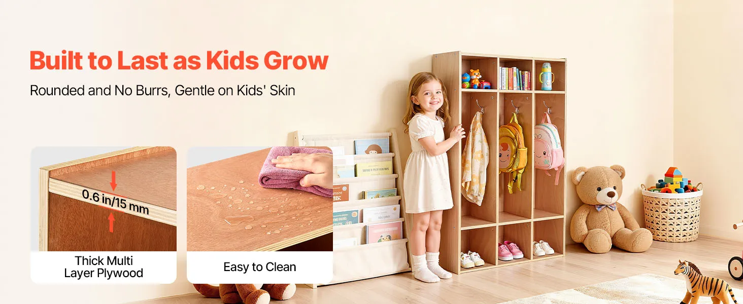 VEVOR Open Kinderkledingkast van multiplex, Kinderkledingkast met 6 haken en 9 vakken (3 grote + 6 kleine), kledingkastplank en opbergplank voor kinderkamer, thuis, kleuterschool, kinderdagverblijf