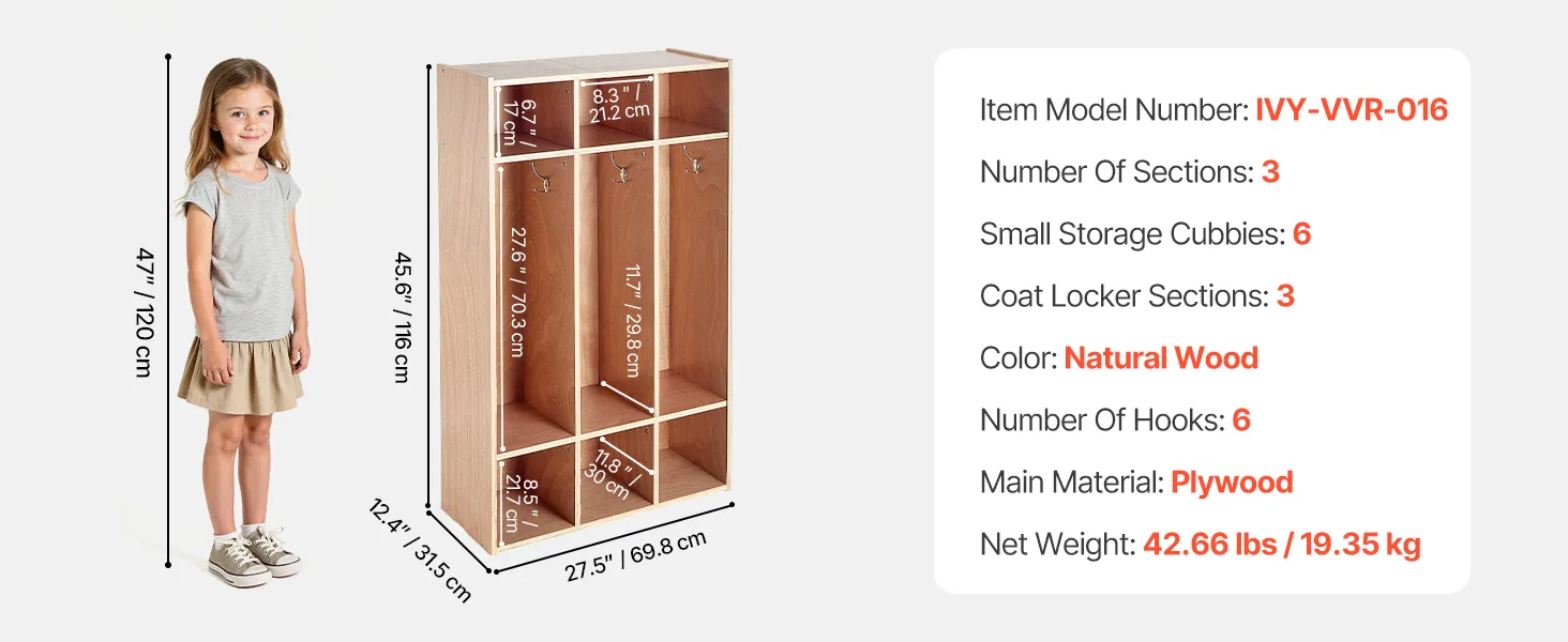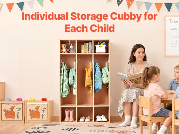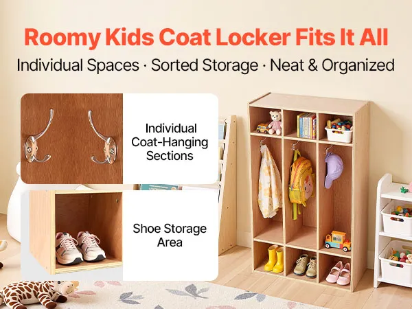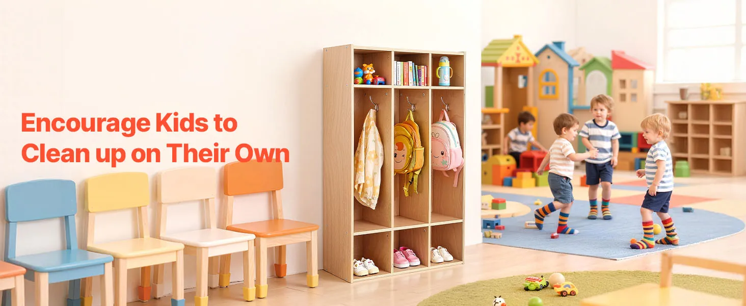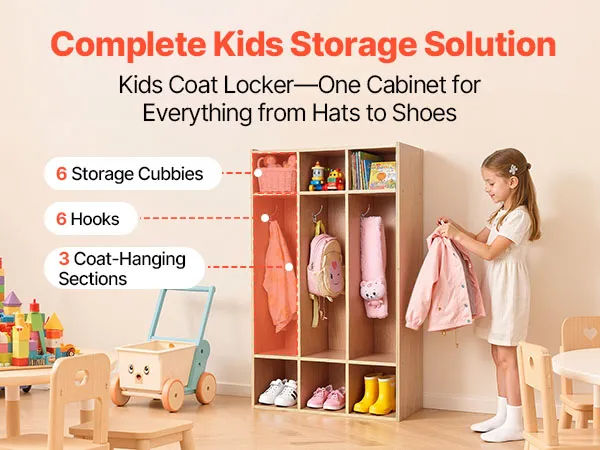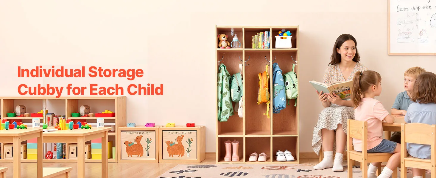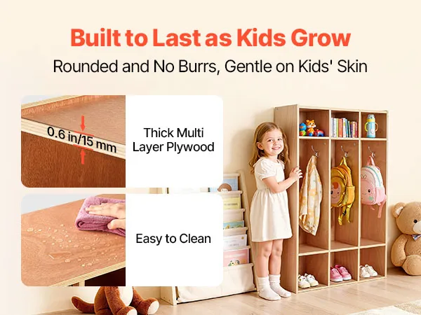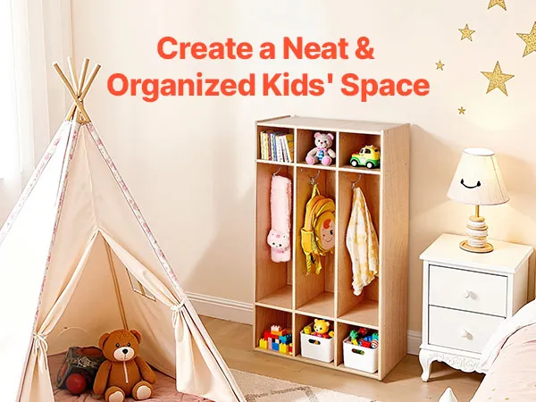 VEVOR Open Kinderkledingkast van multiplex, Kinderkledingkast met 6 haken en 9 vakken (3 grote + 6 kleine), kledingkastplank en opbergplank voor kinderkamer, thuis, kleuterschool, kinderdagverblijf