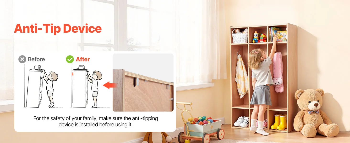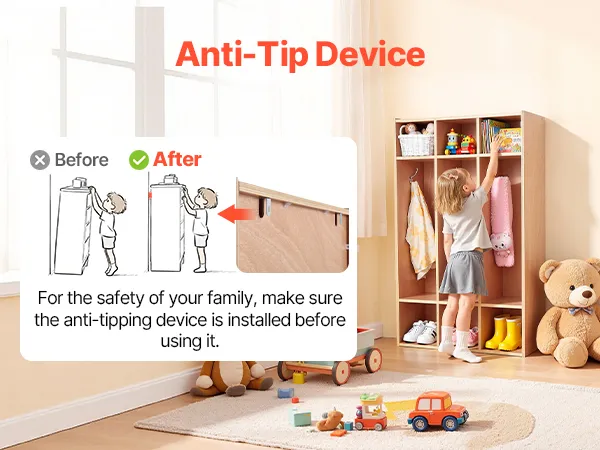 Eenvoudige montage en anti-kantelvoorziening: Deze kinderkast wordt geleverd met een gedetailleerde handleiding en alle benodigde onderdelen voor een snelle montage. Hij is voorzien van een anti-kantelvoorziening voor een veilige wandmontage, waardoor hij niet omvalt en een veilige omgeving voor kinderen wordt gegarandeerd.