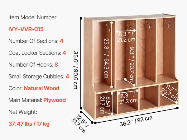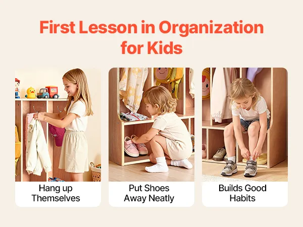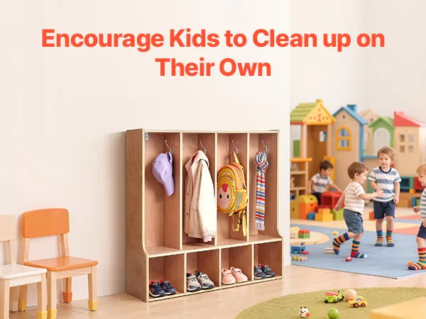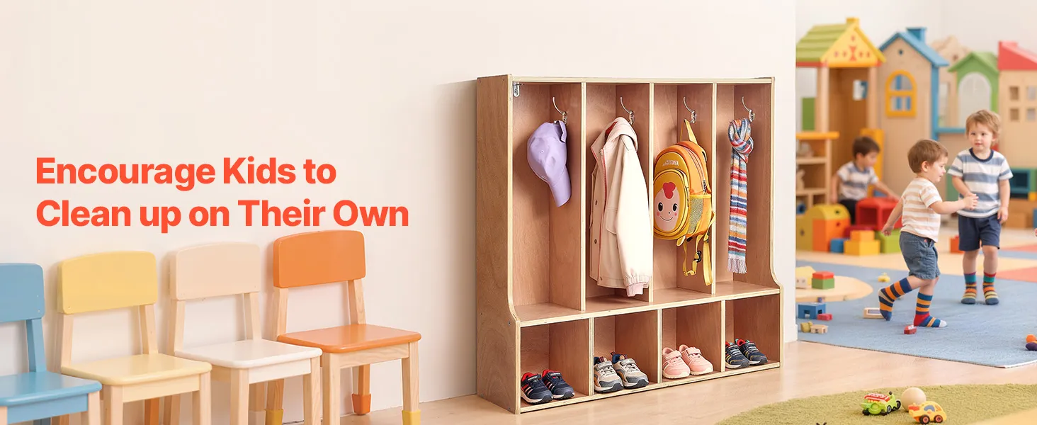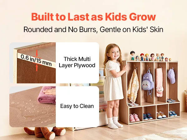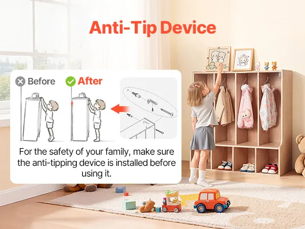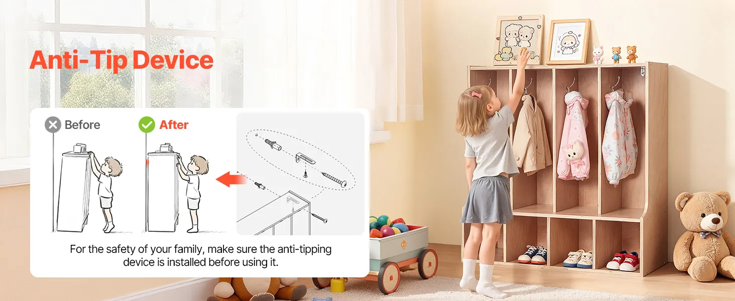 Eenvoudige montage en anti-kantelvoorziening: Deze kledingkast voor in de klas wordt geleverd met gedetailleerde instructies en alle benodigde onderdelen voor een snelle montage. Hij is voorzien van een anti-kantelvoorziening voor een veilige wandmontage, waardoor hij niet omvalt en een veilige omgeving voor kinderen wordt gegarandeerd.