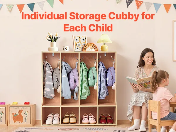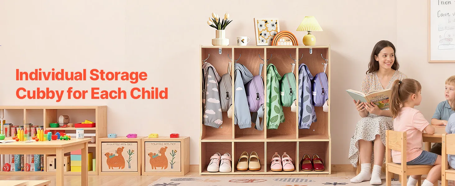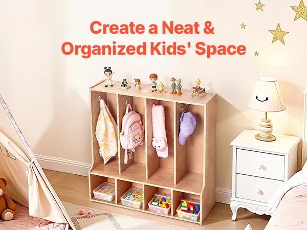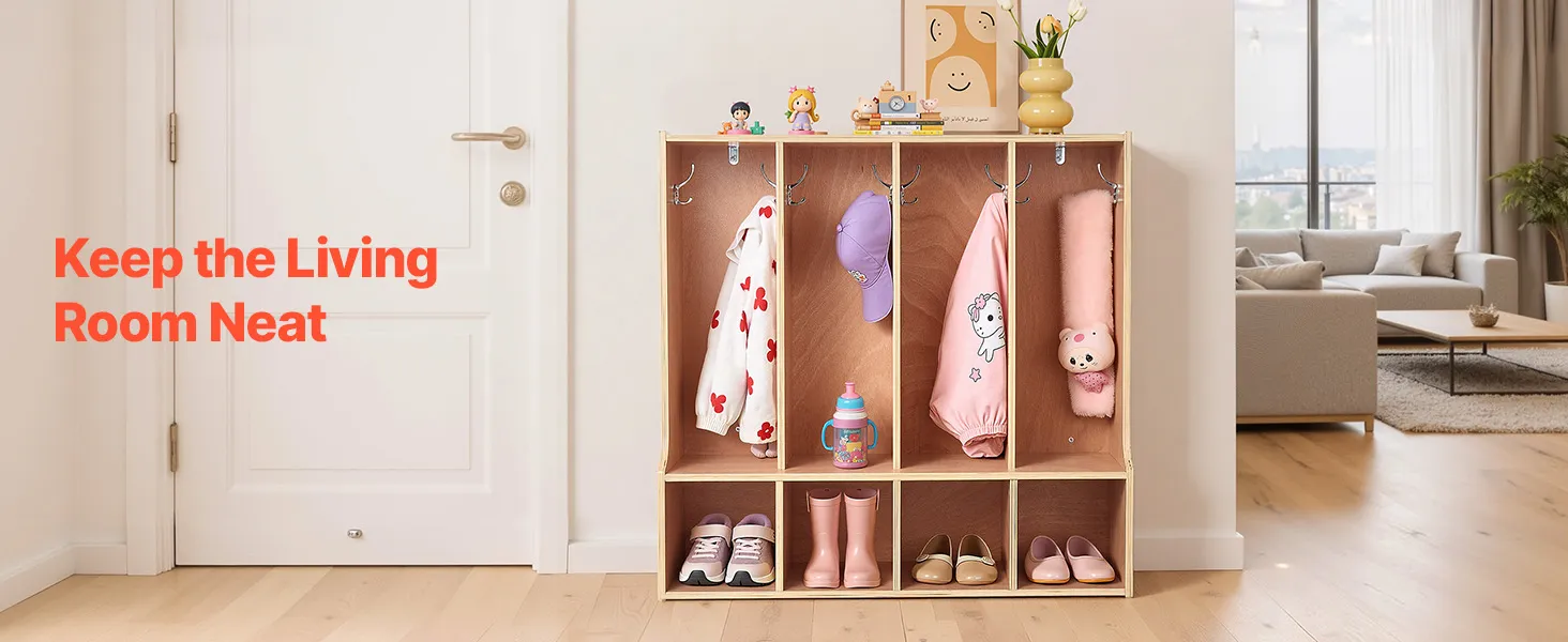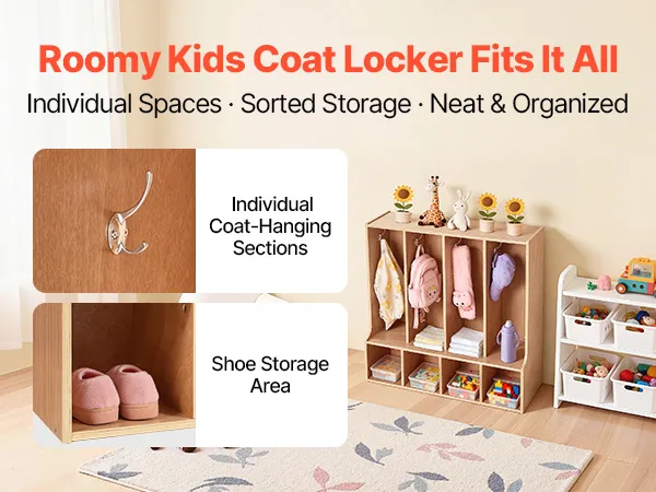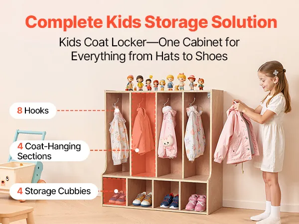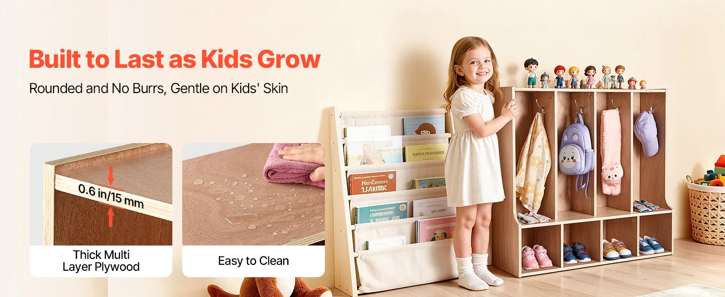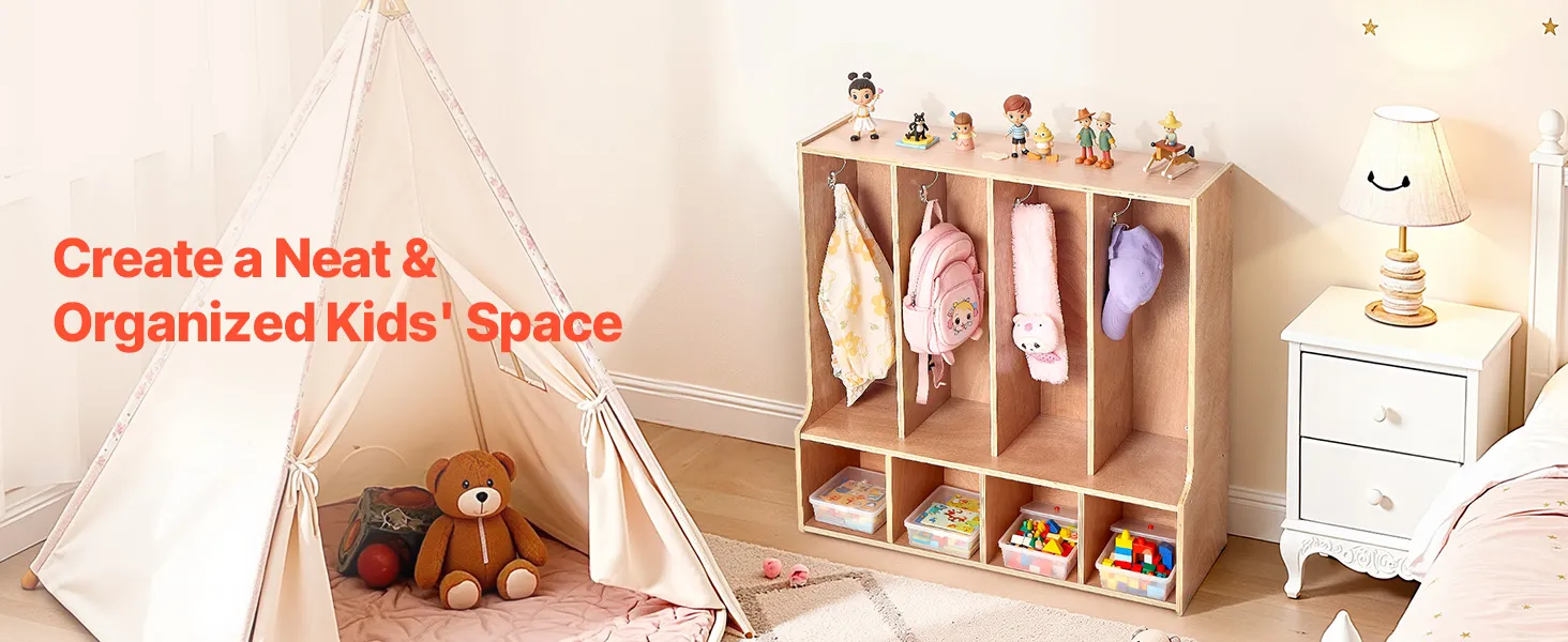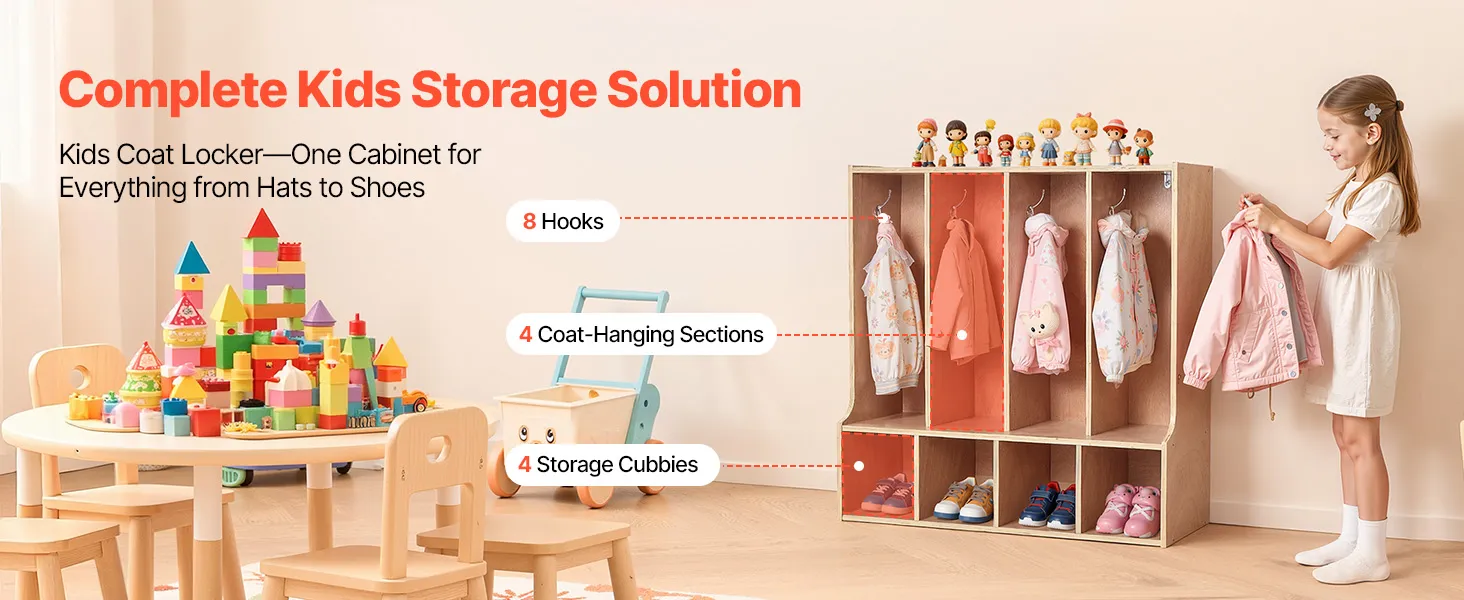 VEVOR Open Kinderkledingkast van multiplex, kinderkledingkast met 8 haken en 8 vakken (4 grote + 4 kleine), kledingkastplank en opbergplank voor kinderkamer, thuis, kleuterschool, kinderdagverblijf