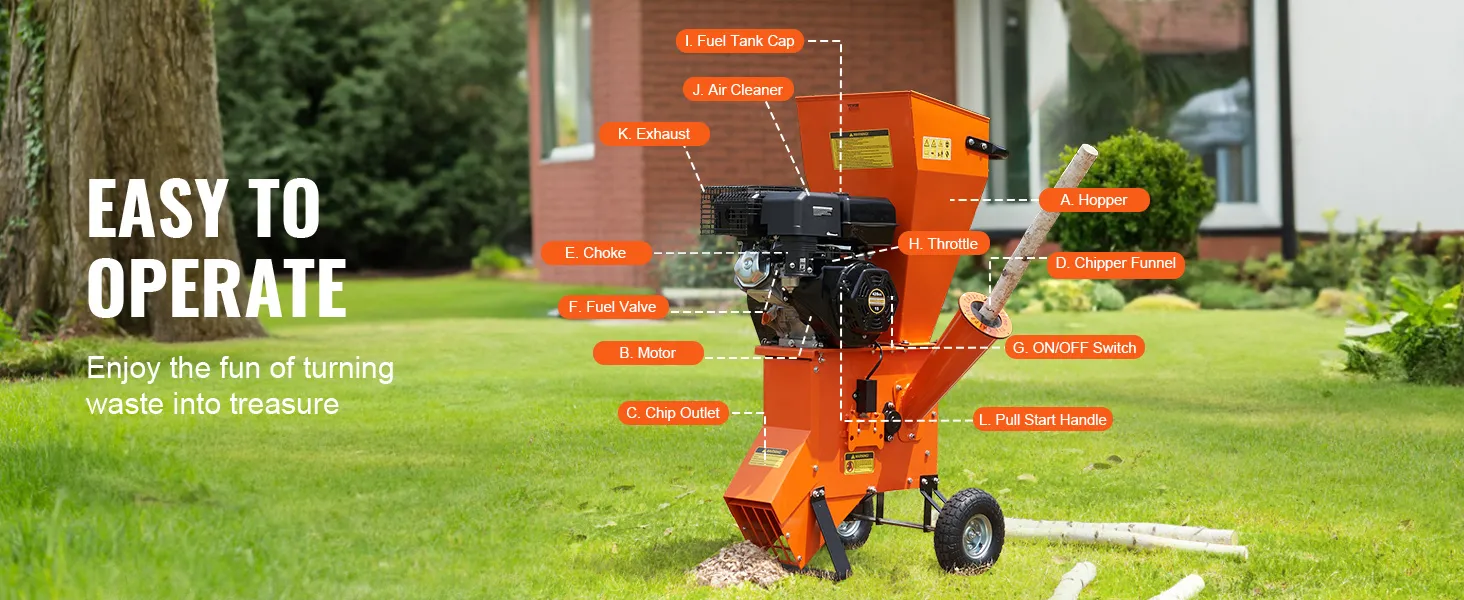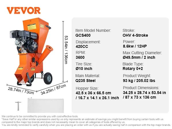 De VEVOR-houtversnipperaar is voorzien van een krachtige 420cc-motor en een efficiënt 0+2-mesontwerp. Met een maximale snijdiameter van 49,5 mm is hij met 87 x 73 x 136 cm compact. Stevige stalen constructie, perfect om tuinafval om te zetten in mulch of compost.