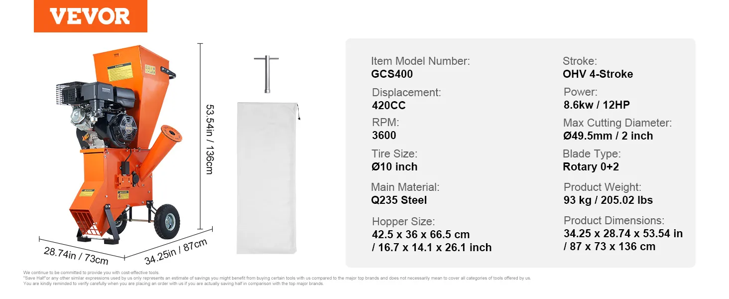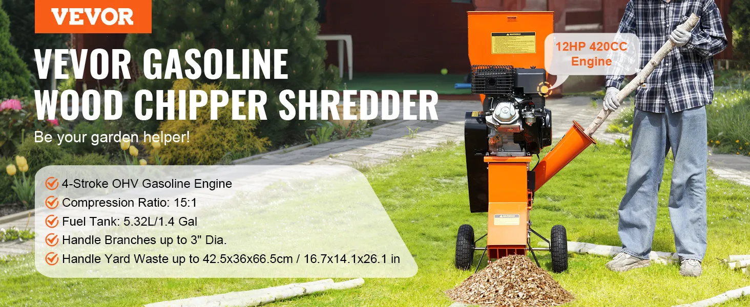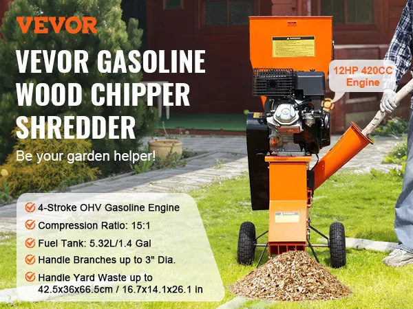 Krachtige motor: Uitgerust met een luchtgekoelde 4-takt OHV-motor van 420 cc, 8,6 kW (12 pk), levert deze versnipperaar tot 3600 tpm. Er wordt gebruik gemaakt van loodvrije benzine met een octaangetal van meer dan 87 (ethanolvrij aanbevolen), met een maximale tankinhoud van 5,32 l (1,4 gallon) en een oliecapaciteit van 1,1 l (0,29 gallon) (motorolie niet inbegrepen).