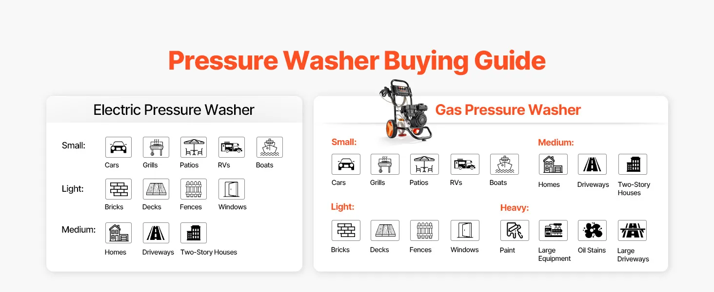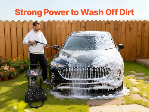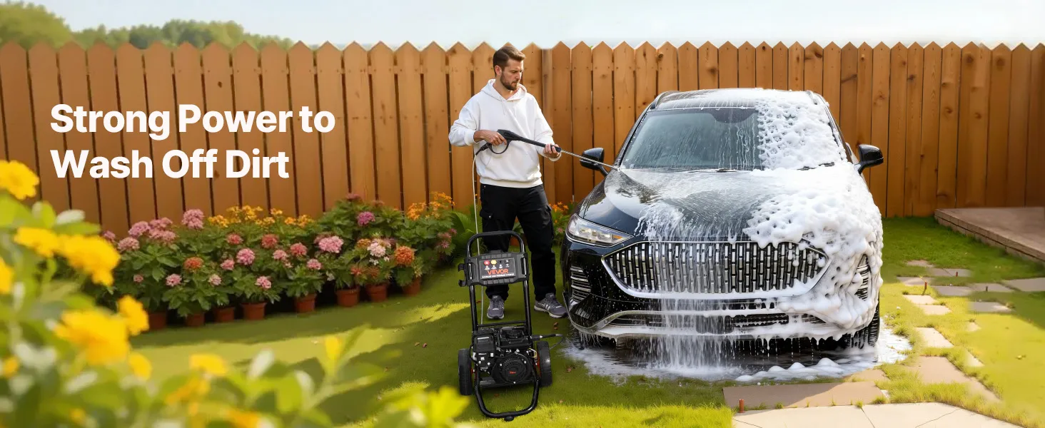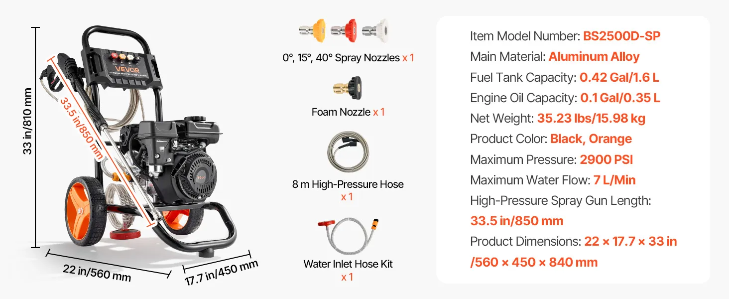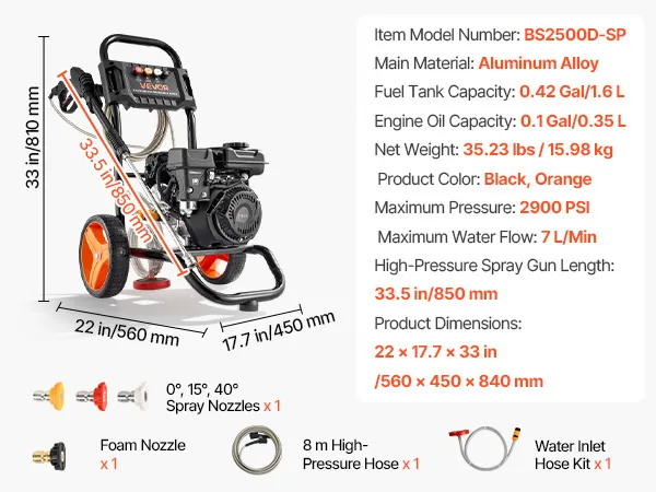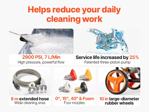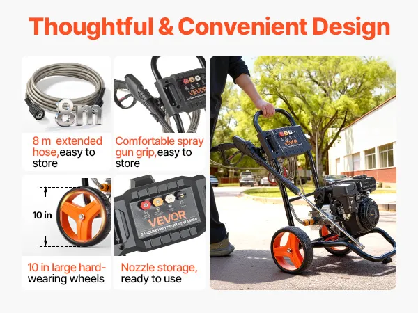 • Groot reinigingsgebied: De 7,9 meter lange hogedrukslang zorgt voor maximale bewegingsvrijheid na aansluiting op de waterbron. De 25 cm wielen van de benzine-terrasreiniger helpen u de hele tuin te reinigen of bestelwagens met vier tot zes zitplaatsen en grote SUV's schoon te maken.
