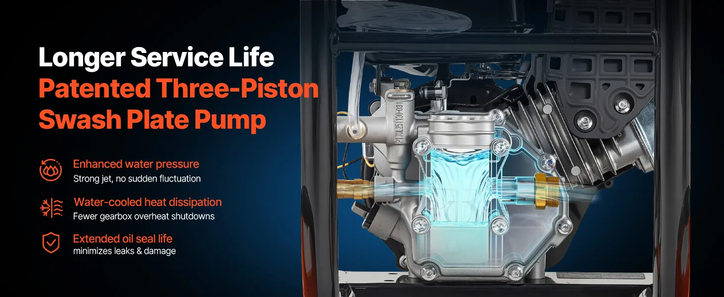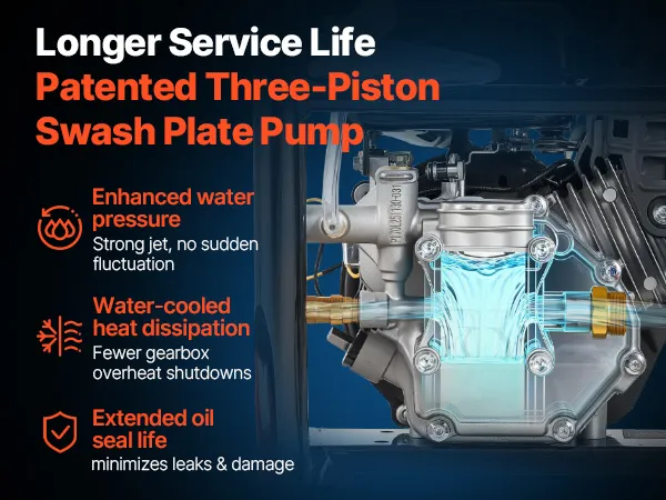 • Lange levensduur: Deze hogedruk benzinereiniger is voorzien van een gepatenteerde driezuiger-tuimelschijfpomp die de warmte in de versnellingsbak afvoert, een stabiele druk garandeert en oververhitting, veroudering van de oliekeerringen en mogelijke lekkages vermindert.