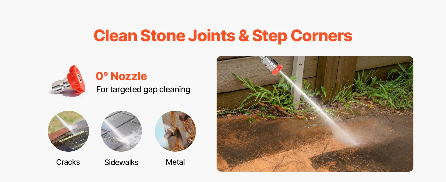 • Vier roestvrijstalen sproeiers: Deze benzine-aangedreven reinigingsmachine is uitgerust met meerdere sproeiers, waaronder 0°, 15°, 40° en een schuimsproeier, waardoor u gericht voegen, hoeken, tegels, opritten, auto's en muren kunt reinigen. De roestvrijstalen sproeiers zijn geschikt voor veelvuldig gebruik.
