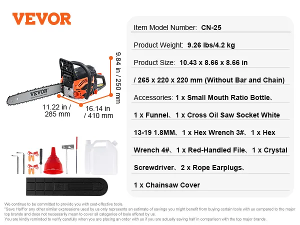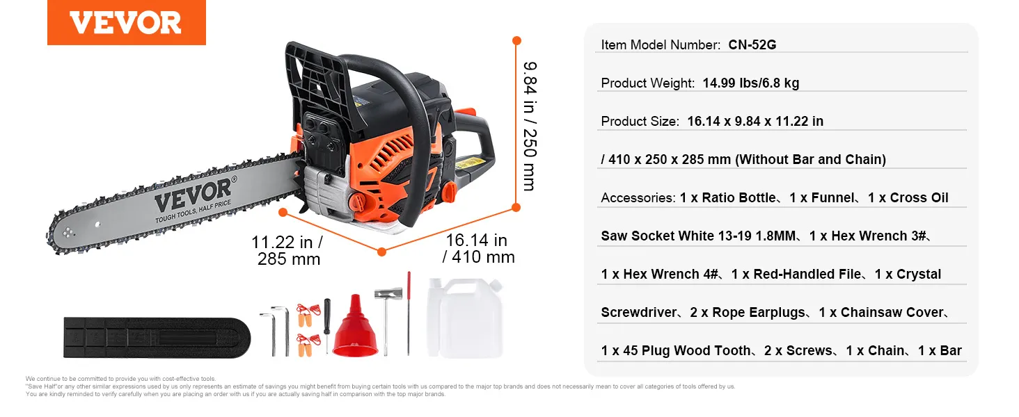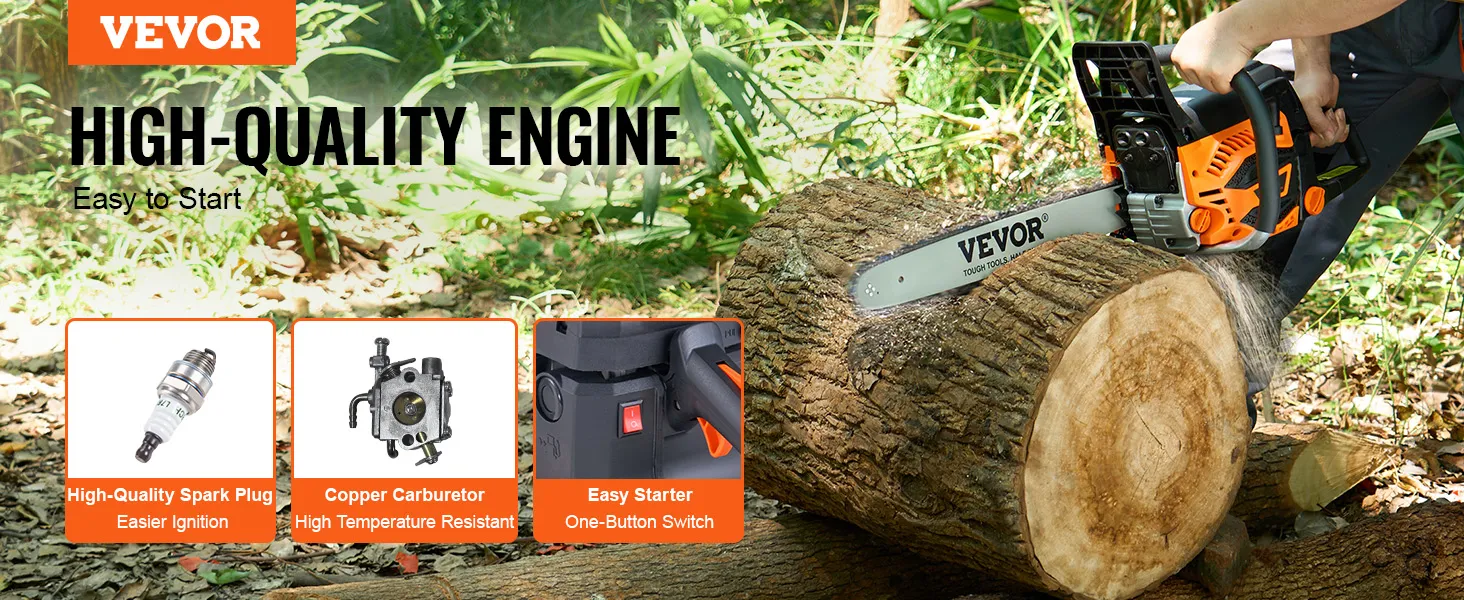 Krachtige prestaties: met een 52 CC-motor zaagt onze benzinekettingzaag gemakkelijk door hout zonder af te slaan. Met een vermogen van 2,55 pk, een motortoerental van 1,9 kW/8500 tpm en een maximaal toerental tot 12.000 tpm kunt u door krachtige prestaties genieten van het ultieme bedieningsgevoel.