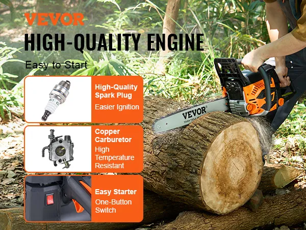Met de easy start-functie van onze benzinekettingzaag kun je binnen een mum van tijd aan de slag. Druk gewoon op de knop en je bent klaar om te gaan. De premium bougie en messing carburateur zorgen keer op keer voor een soepele start, zelfs bij warm weer.